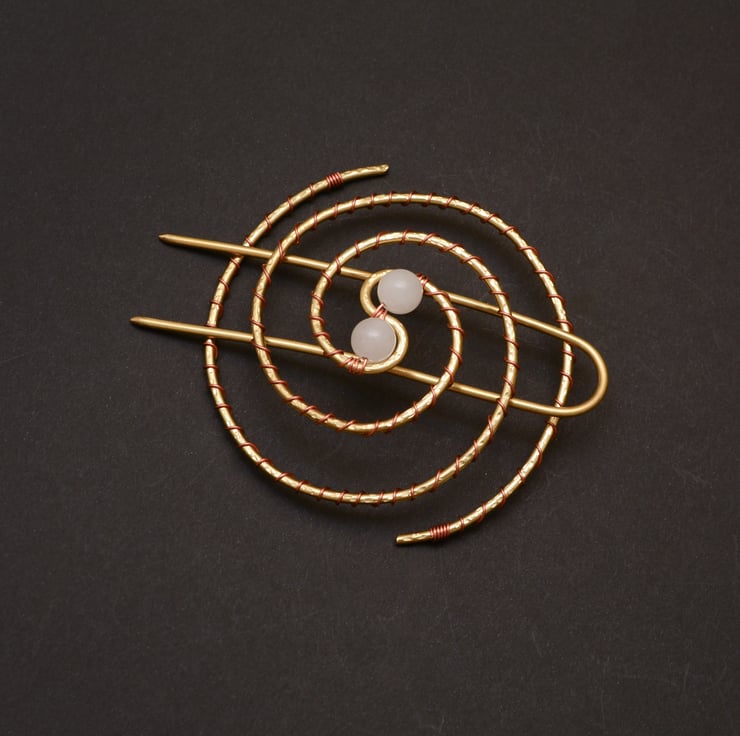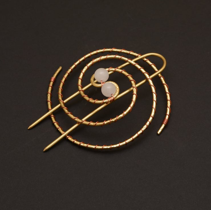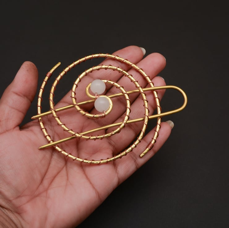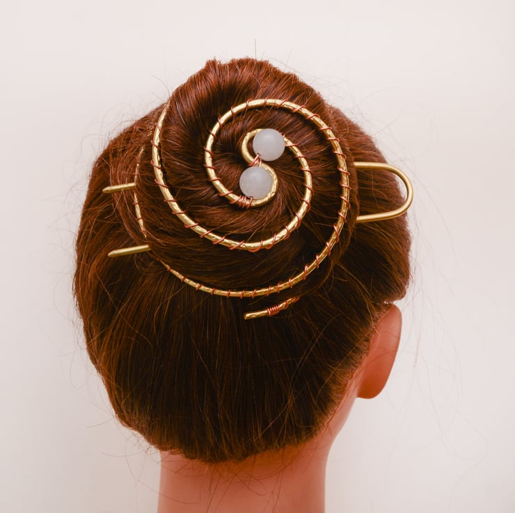 Beautiful elegant hair bun slide made of brass wire and copper wire are wrapped with pale white agates.