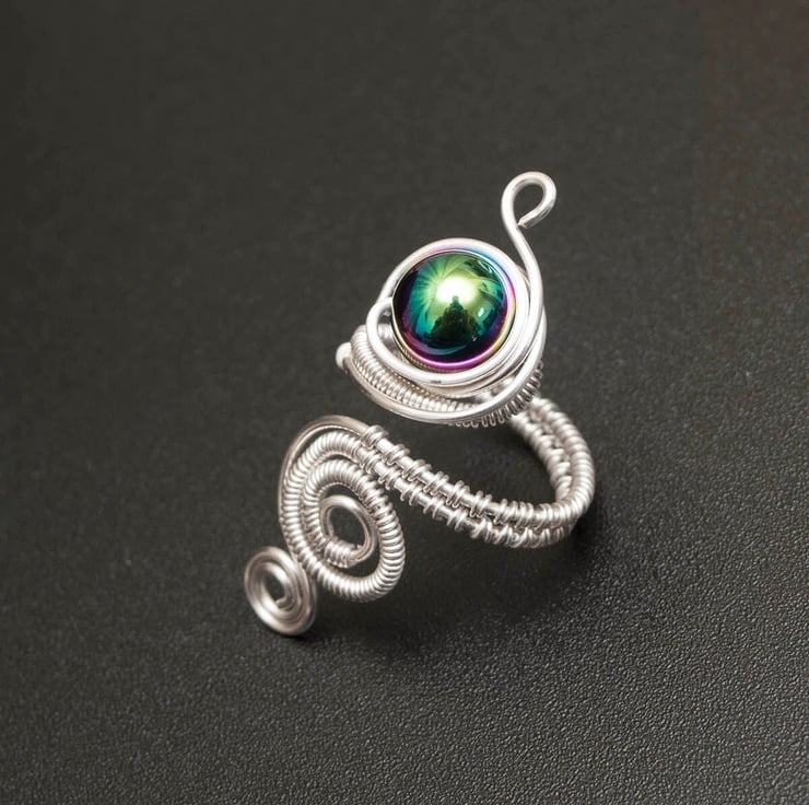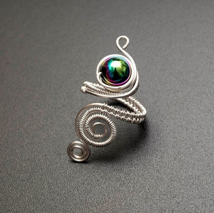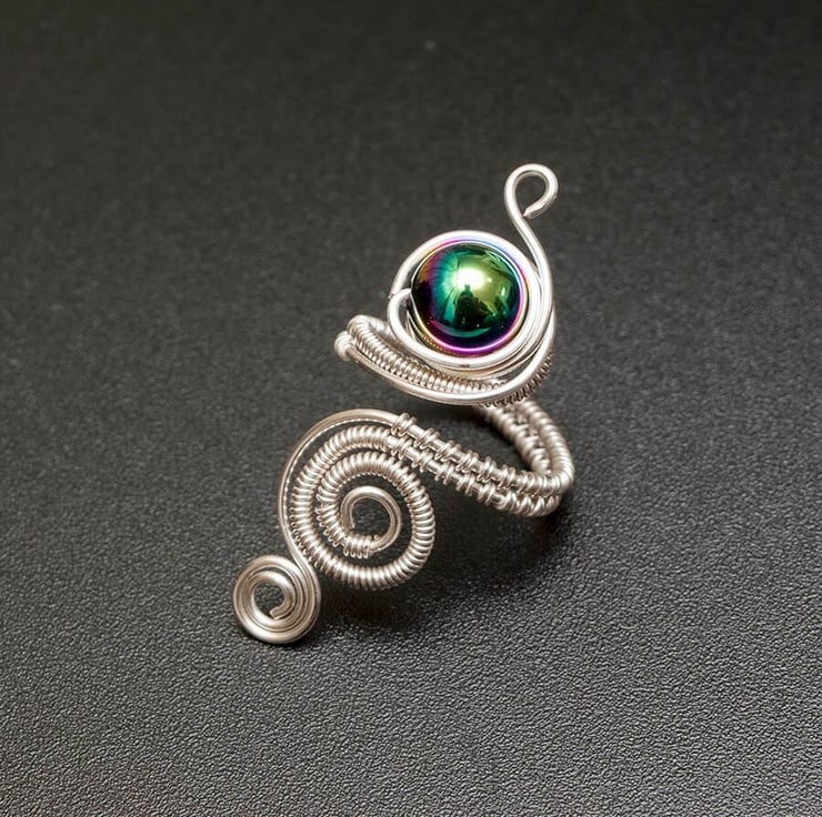 This handcrafted adjustable ring combines sleek shine of silver wire, artfully wrapped around a rainbow-coated hematite bead.