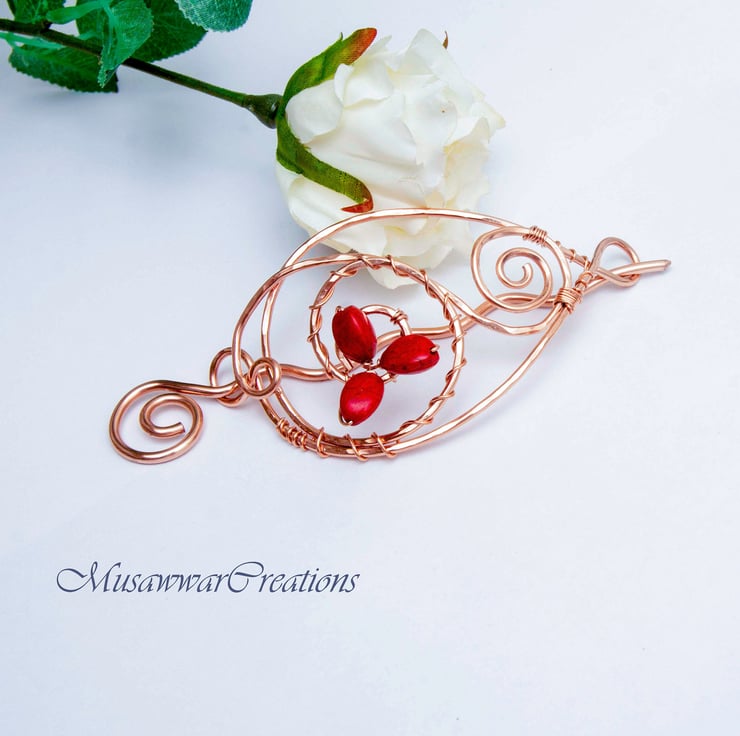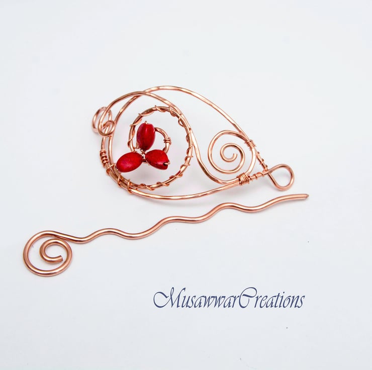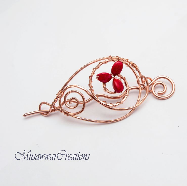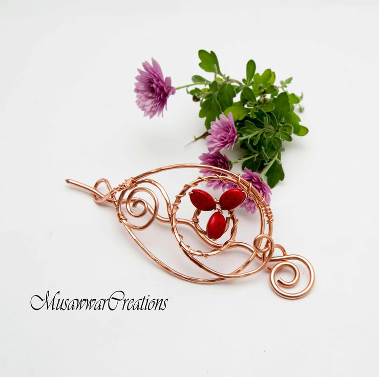 Beautiful hair brooch made of solid copper wire and wrapped with red agate gemstone.
