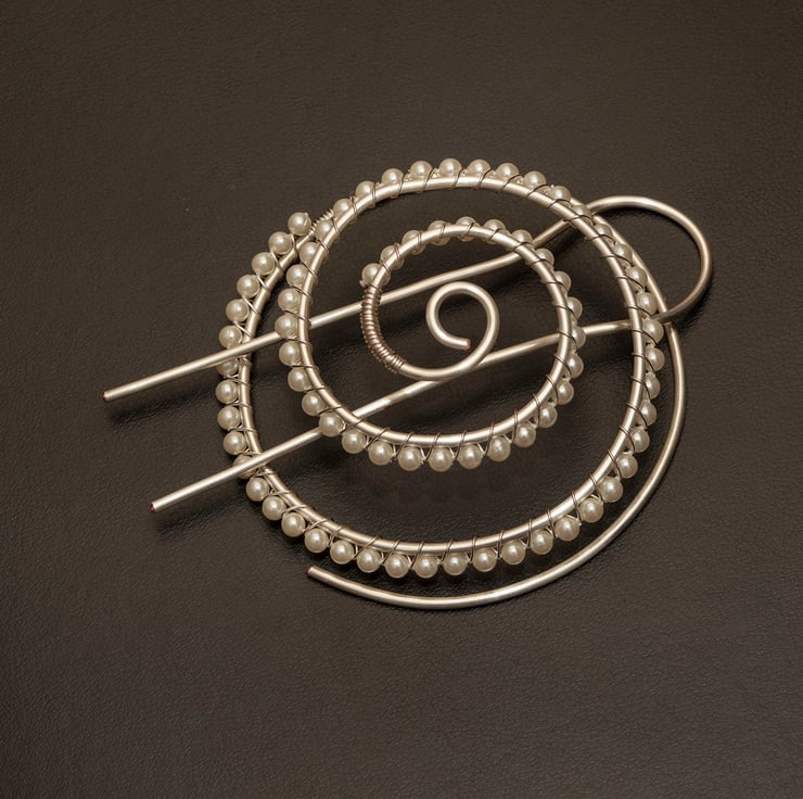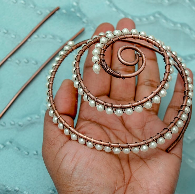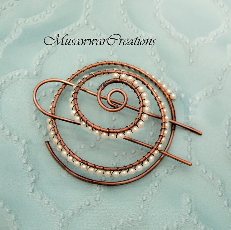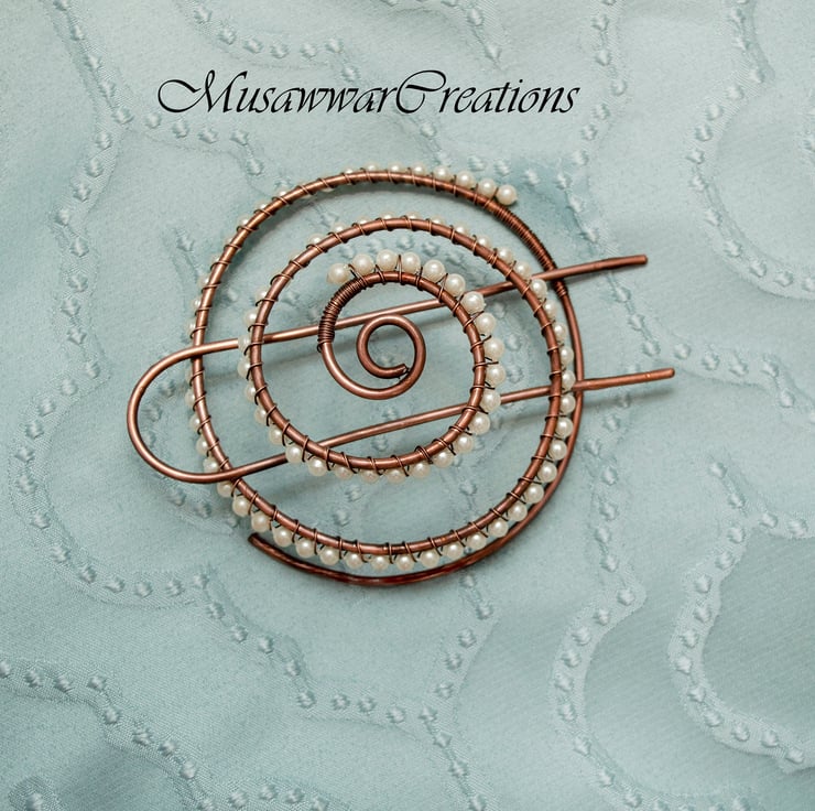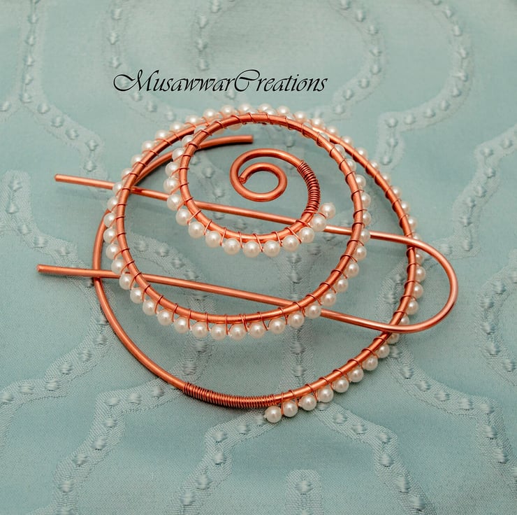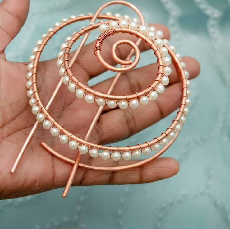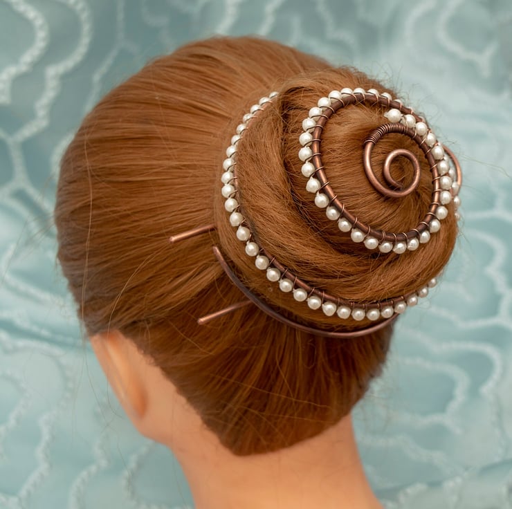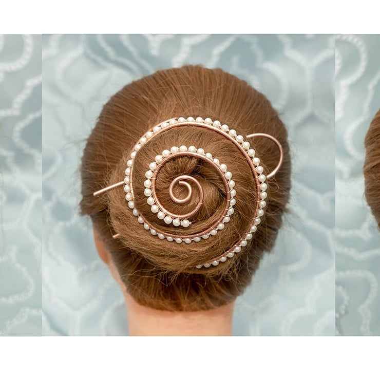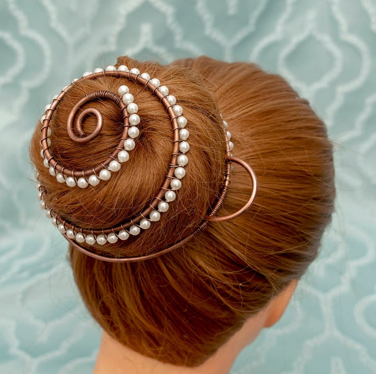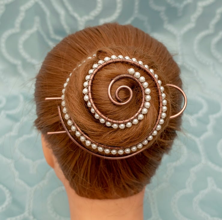 This handcrafted spiral hair cage is wrapped with 4mm white beads, creating a delicate contrast against the warm antique copper tone. The U-shaped fork is designed to hold the spiral bun firmly in place, making it suitable for thick, medium, or fine hair.