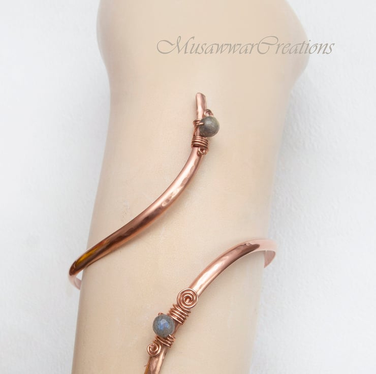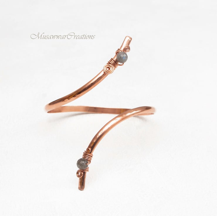 An elegant and unique handcrafted arm cuff bracelet, made from solid copper and beautifully wrapped with 9mm labradorite stones. Each piece is individually handmade, highlighting the natural shimmer of labradorite against the warm tone of copper — creating a bold yet graceful statement accessory.