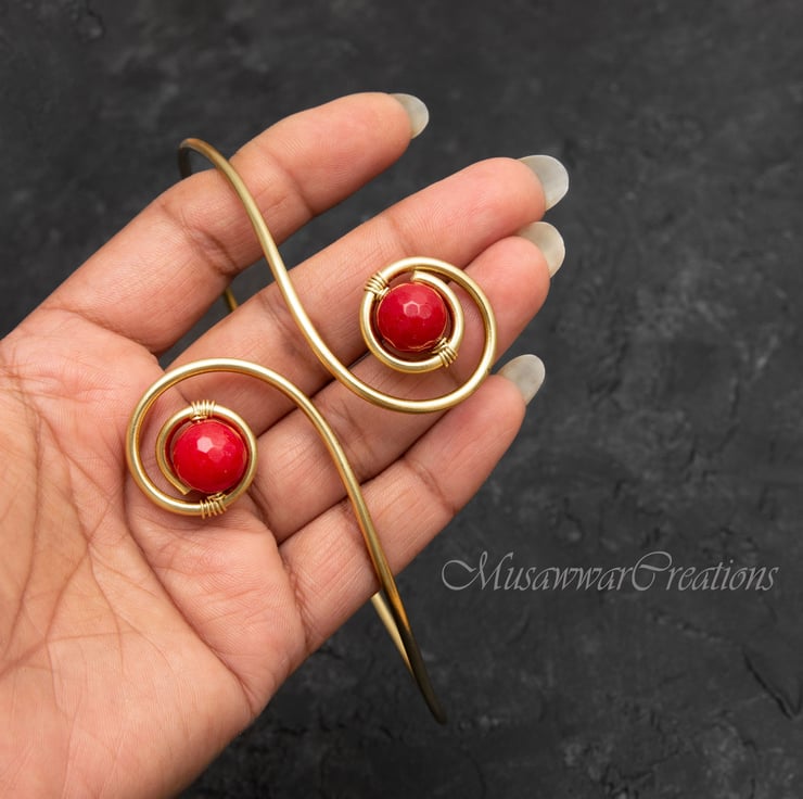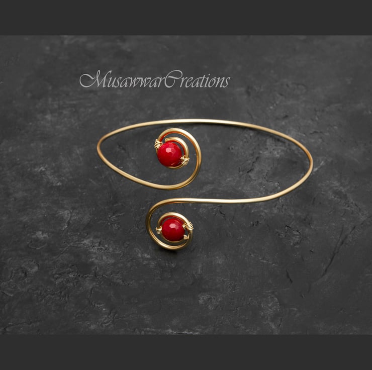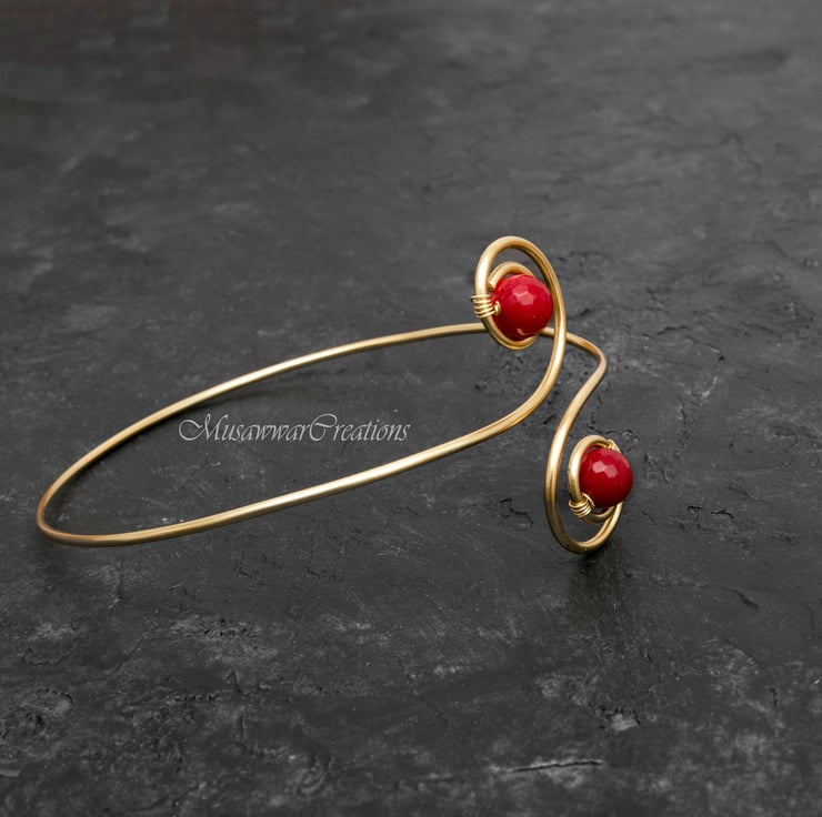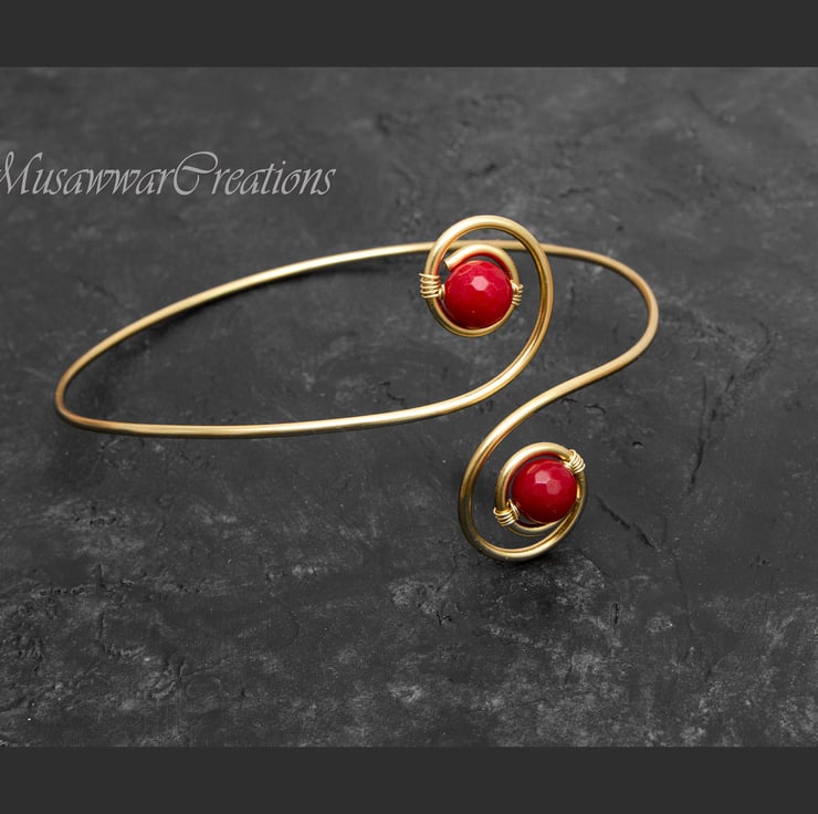 Handmade upper arm cuff made of thick solid Brass wires .This is wrapped with red quartz.