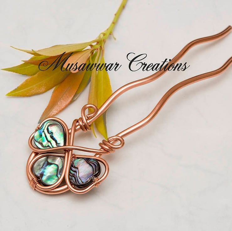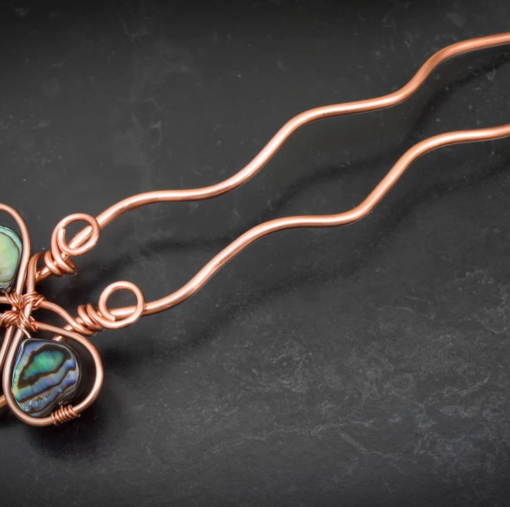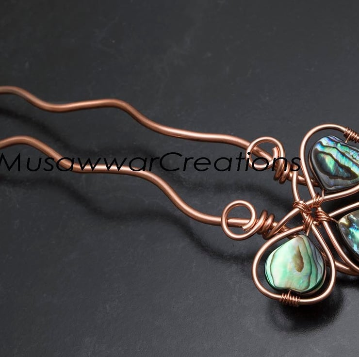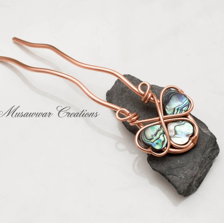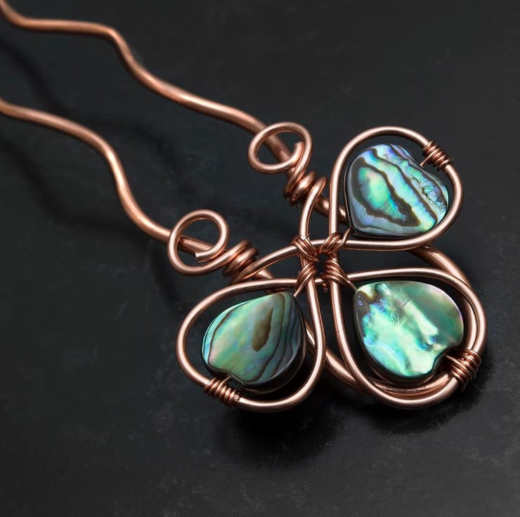 This beautiful three-leaf clover hair fork is handcrafted from solid copper wire and adorned with Abalone flat heart accents (approx. 16mm). Each piece is carefully wire-wrapped, showcasing the natural iridescence of abalone against the warm glow of polished copper.