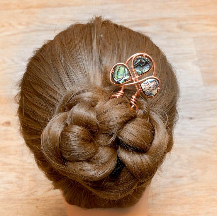 Abalone Copper Hair Fork,Three Leaf Clover Hair Pin,Wire Wrapped Copper