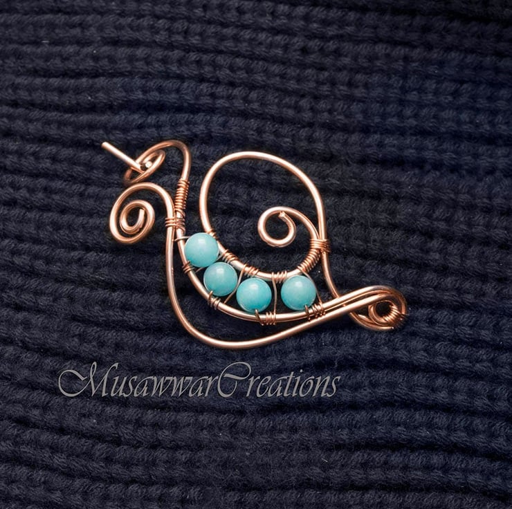 Teal quartz shawl pin,copper wire scarf pin, sweater pin, swirl design shawl pin