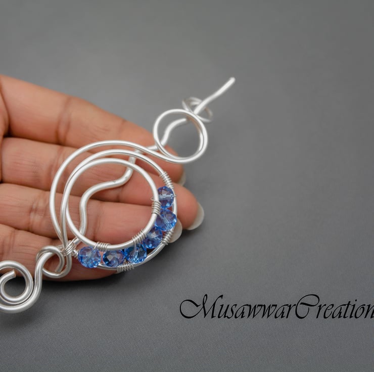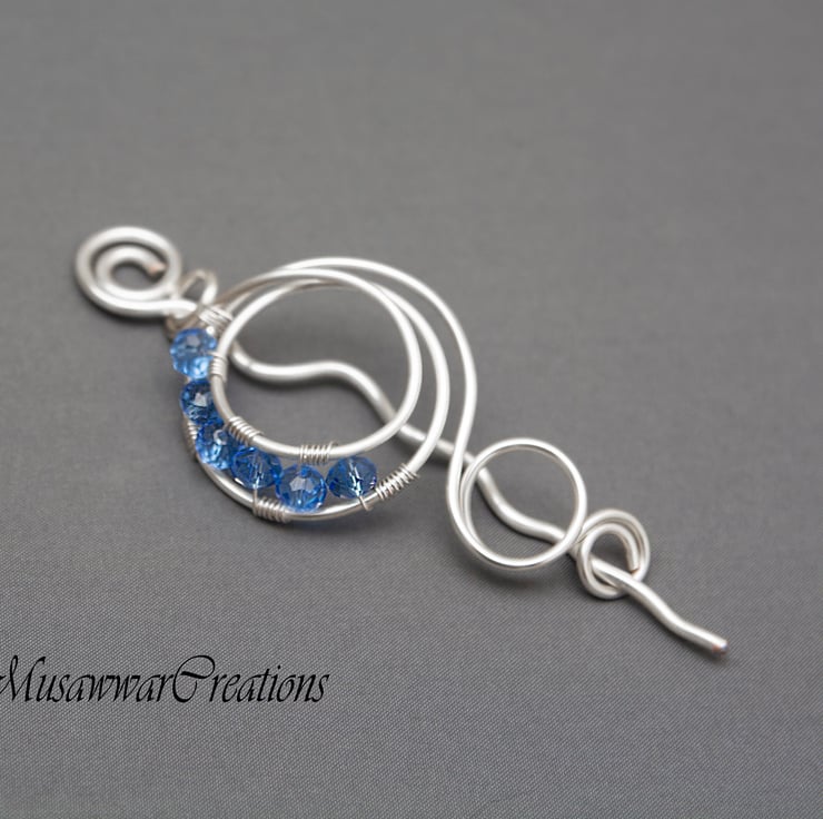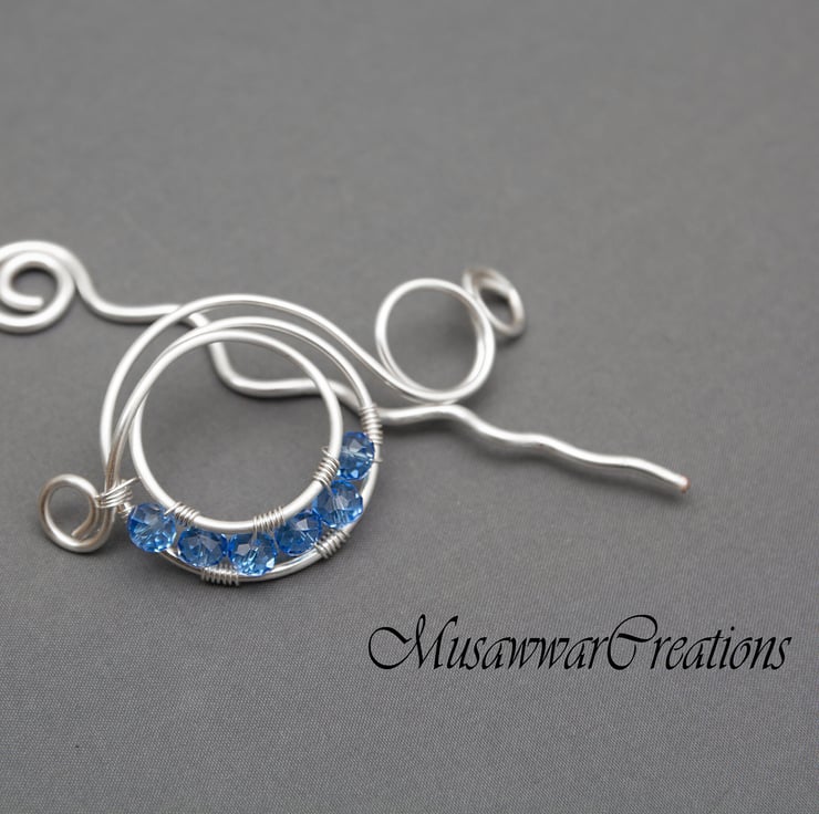 This hair slide made of silver-plated copper wire and wrapped with faceted light blue crystal beads.