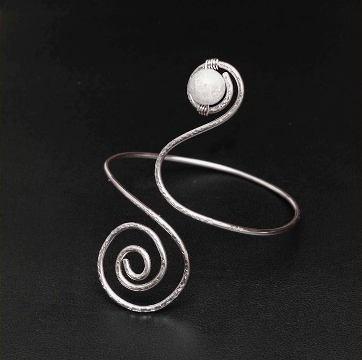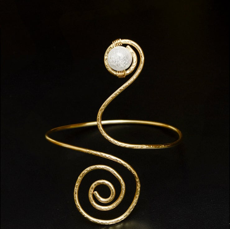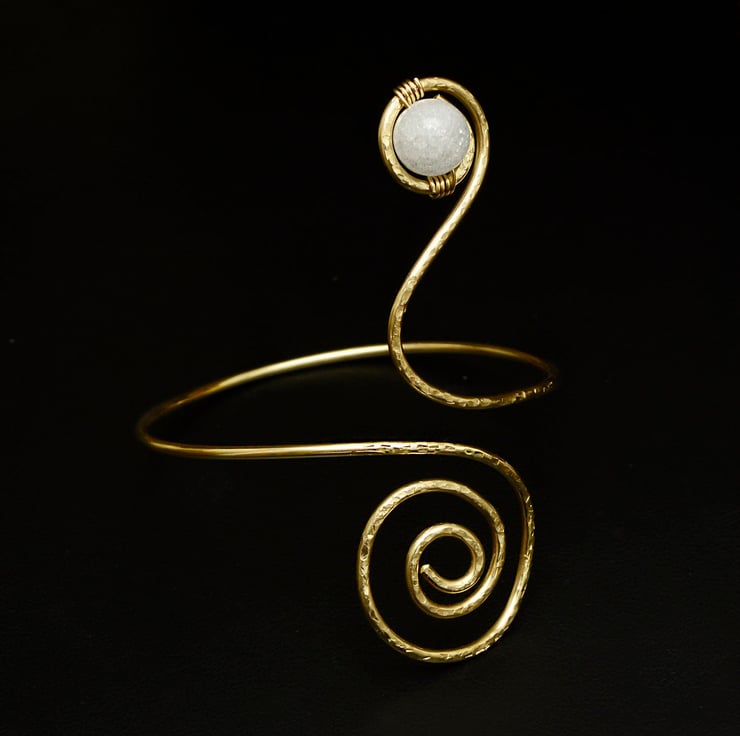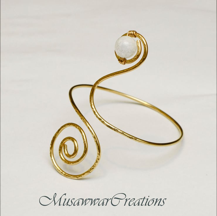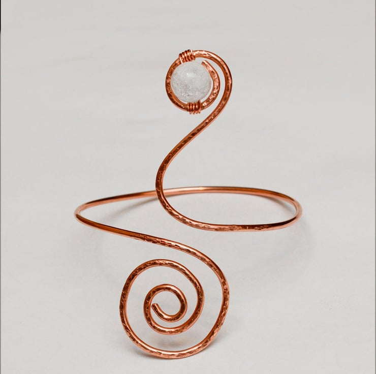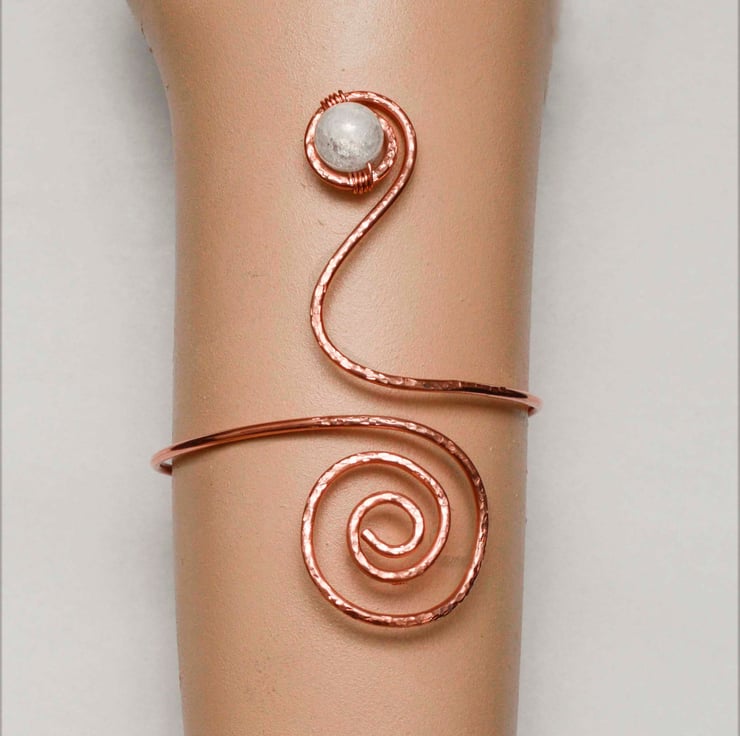 The arm cuff made of 10 gauge of wire .Copper wire first shaped by hand , hammered and textured to give extra strength to maintain its shape and than hand polished.