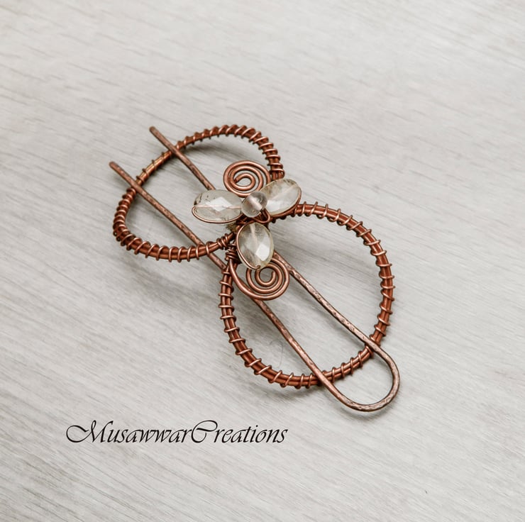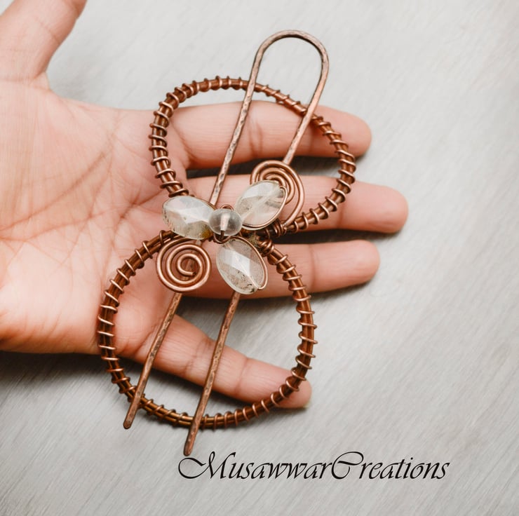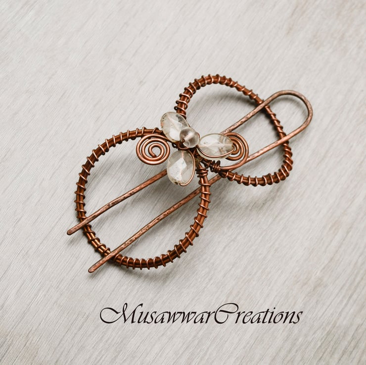 Create a unique and beautiful hairstyle with this heavy-duty antique copper butterfly bun holder. Designed to hold hair securely all day, it adds elegance and charm to any occasion. Wrapped with genuine oval quartz beads, this accessory sparkles subtly while enhancing your hairstyle.