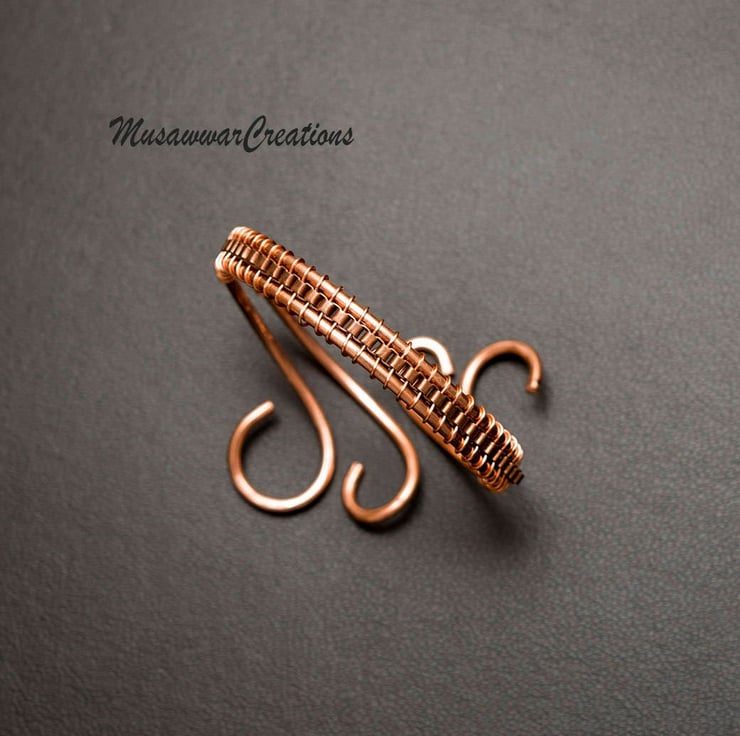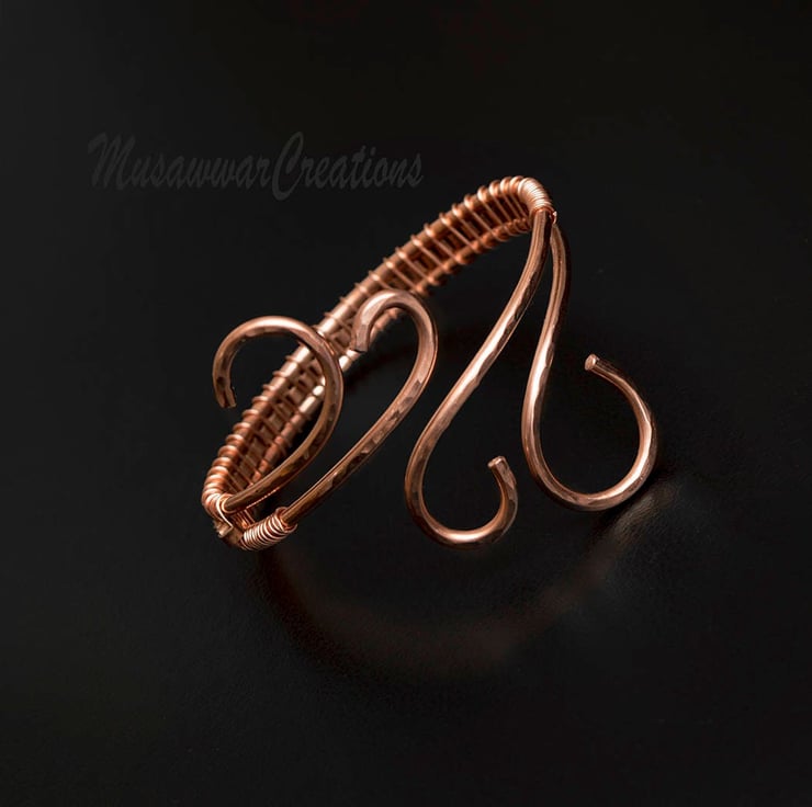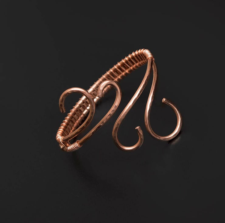 This unisex cuff bracelet is handcrafted from solid copper wire, skillfully wrapped to create a bold and stylish design. Its heavy-duty construction ensures durability while maintaining an elegant, artisanal look.