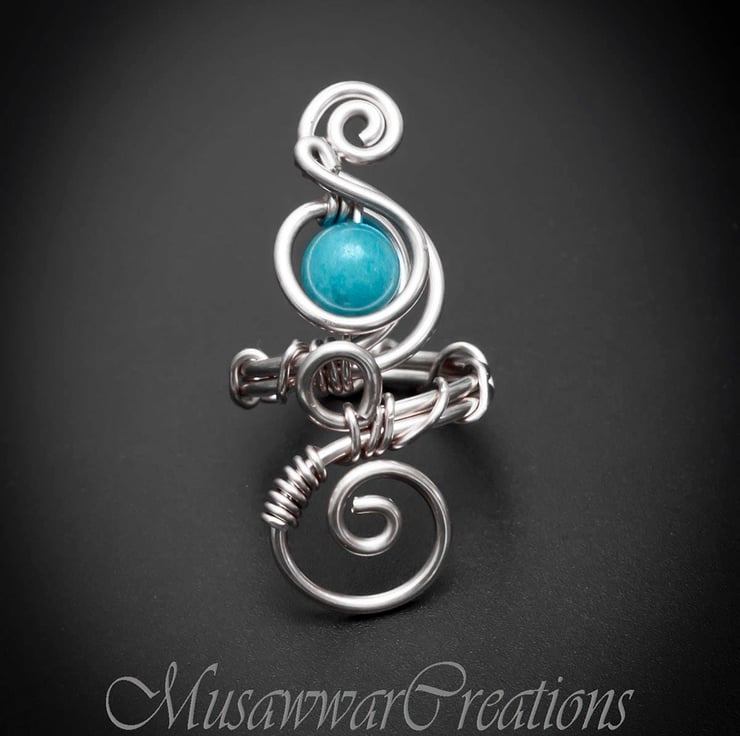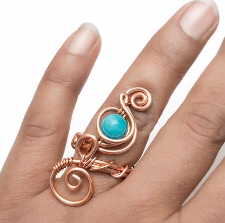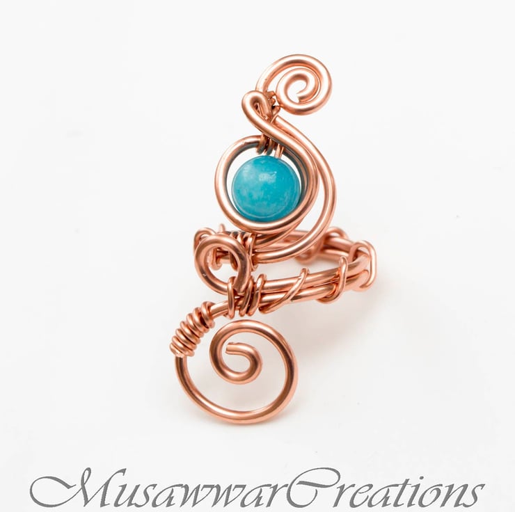 This ring is made of 1.50 mm thick gauge copper wire and wrapped with light blue quartz 9mm.