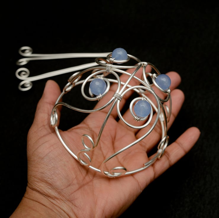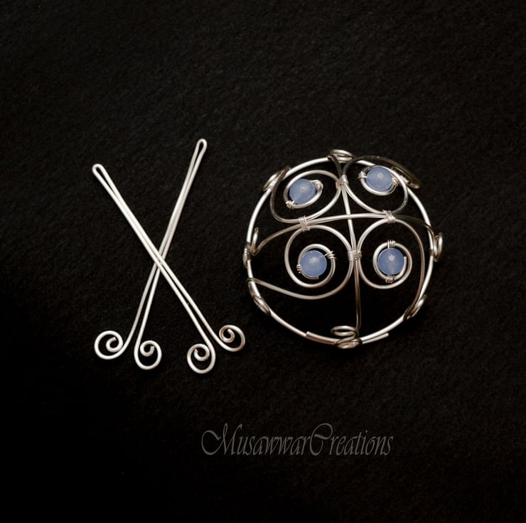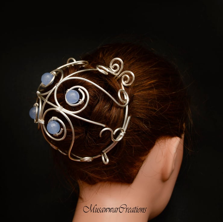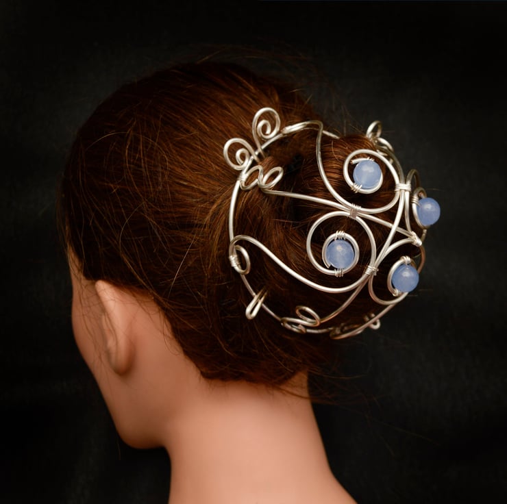 Light pale blue agates Silver Spiral design silver bun cage,hair bun holder,