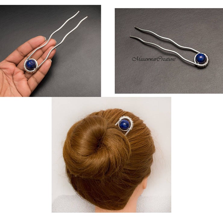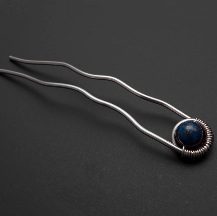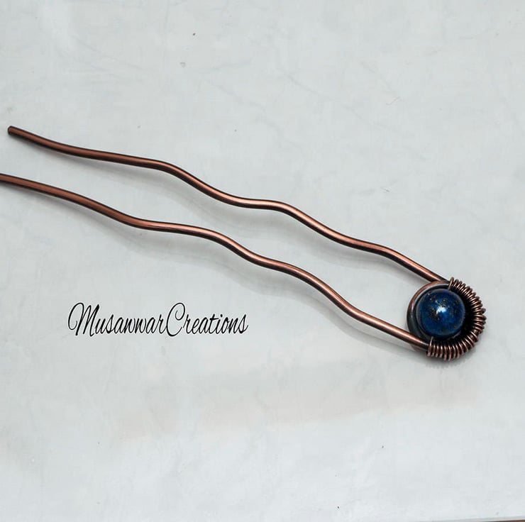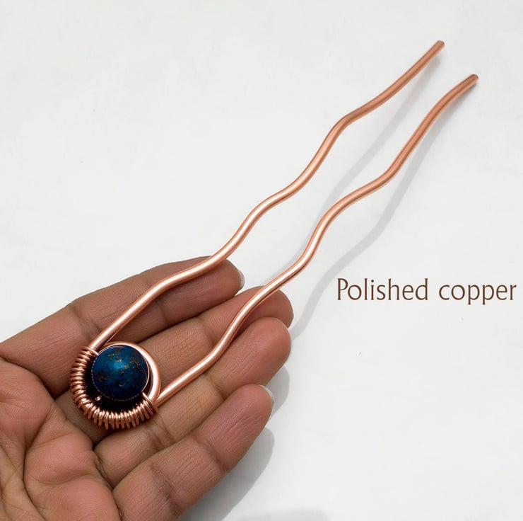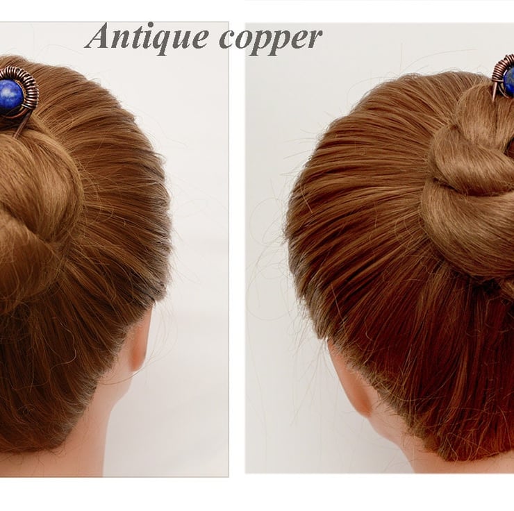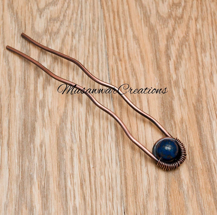 Handmade solid Antique copper hair bun fork .It is made of heavy duty wire and wrapped with 16mm chunky Lapis Lazuli stone.