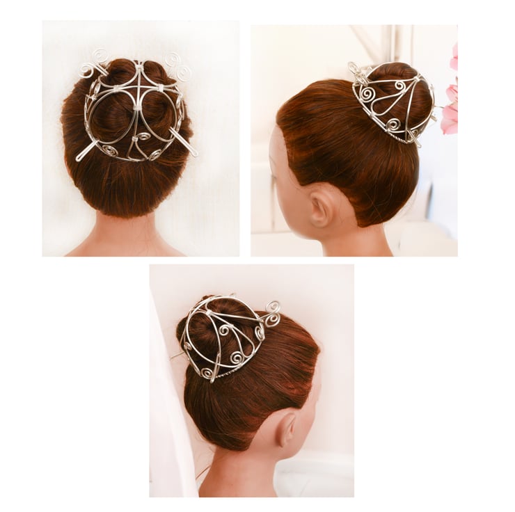 Each piece is hammered, textured, and swirled by hand, giving it both strength and a distinctive artisanal look. The bun cage features a deep dome curve measuring approximately 2.3 inches in depth and 3.5 inches in diameter, making it ideal for holding long or thick hair. It comes with two matching pins for extra hold and styling versatility.