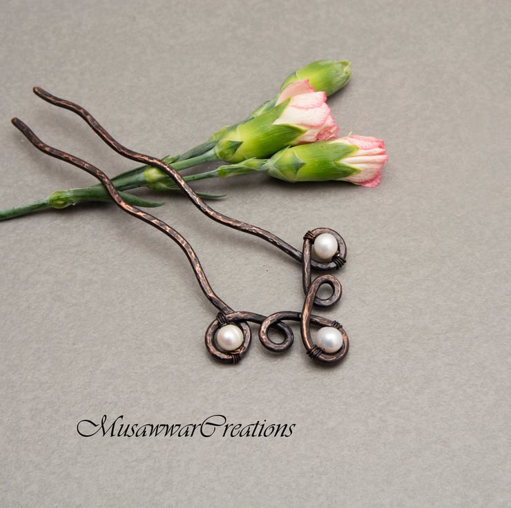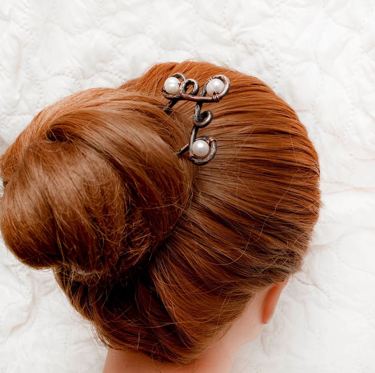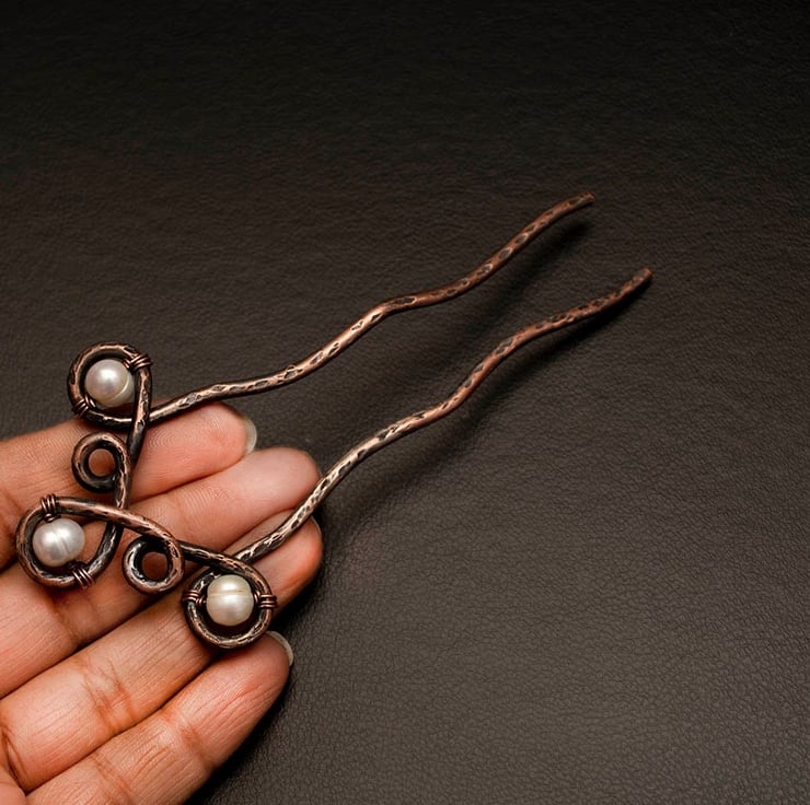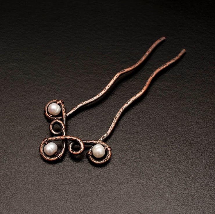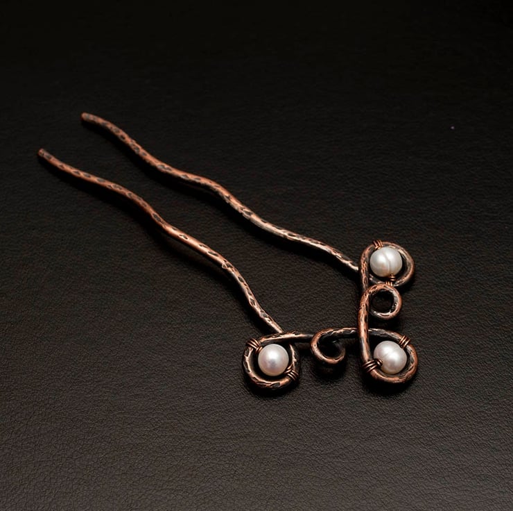Elevate your hairstyle with this handcrafted antique copper hair fork, designed to hold your bun or updo securely while adding a touch of Celtic elegance. Each fork is carefully handmade, featuring a beautifully detailed Celtic motif and adorned with lustrous white pearls for a timeless, sophisticated look.