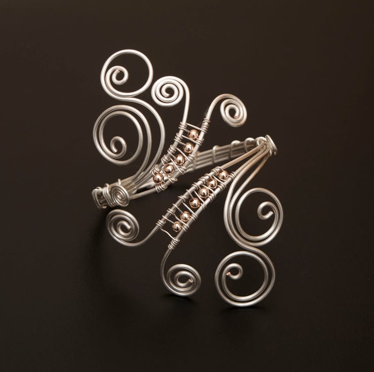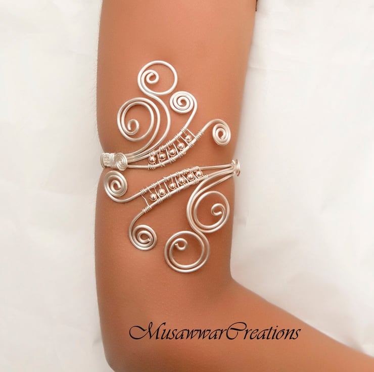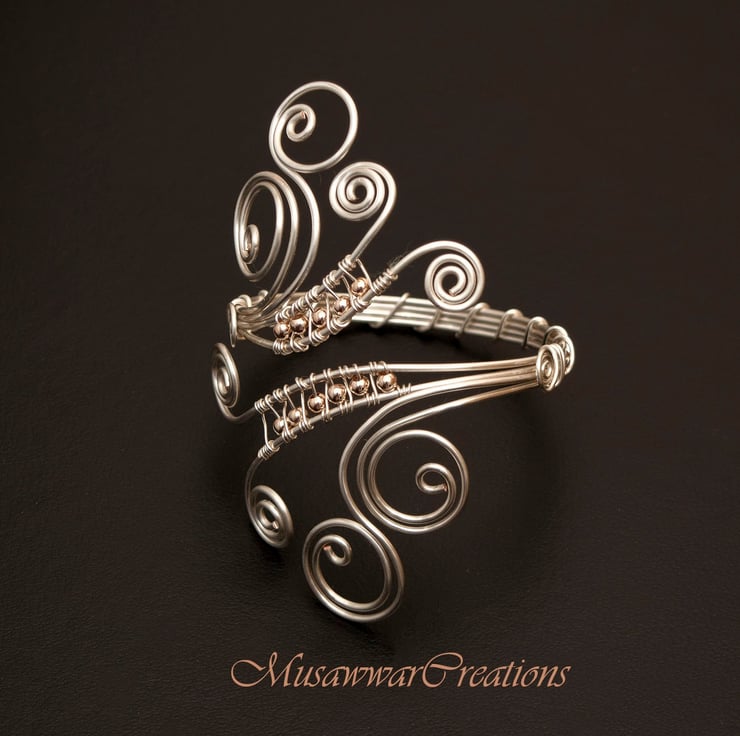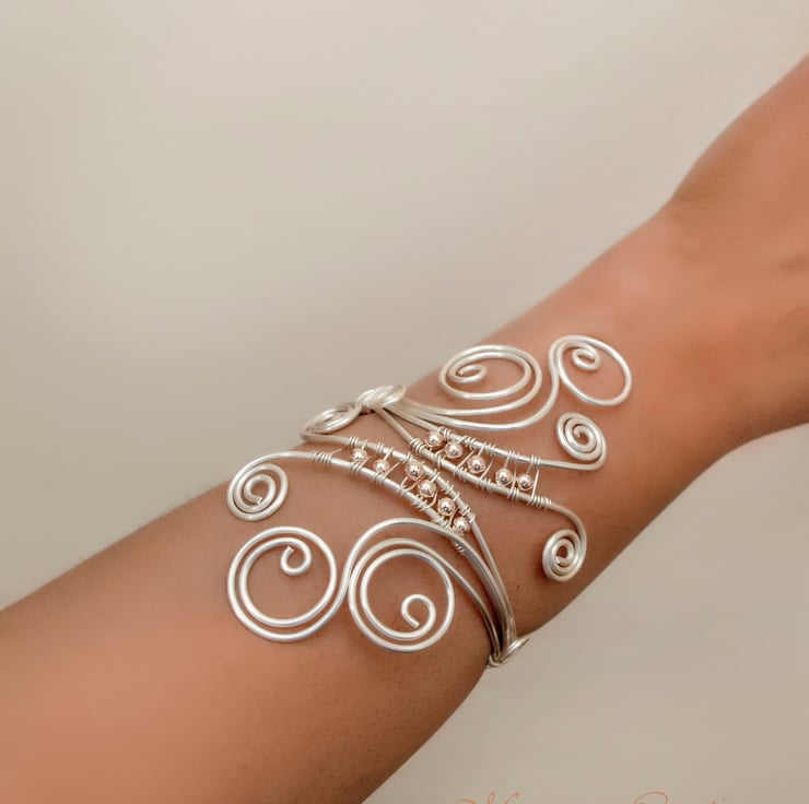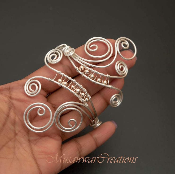 Beautiful and elegant arm cuff is carefully handcrafted made out of silver played wire.