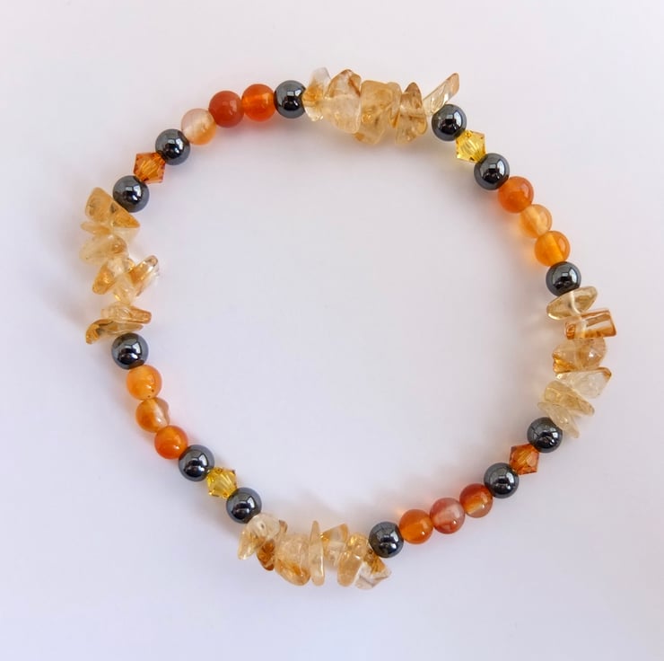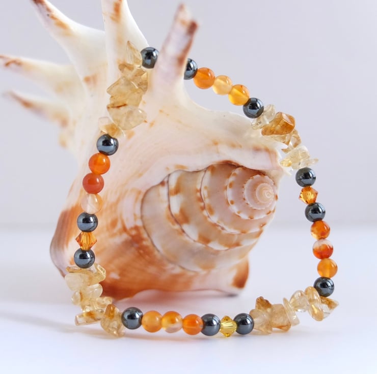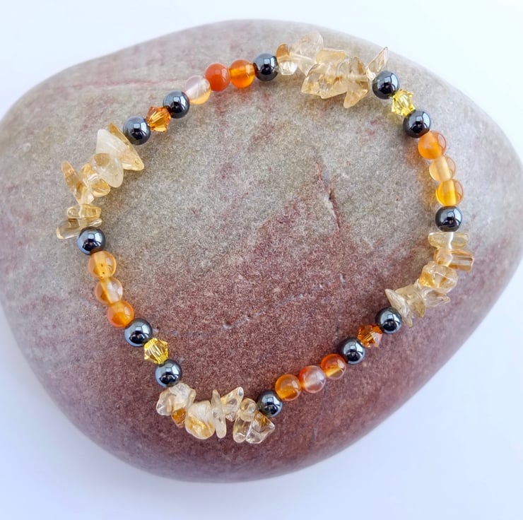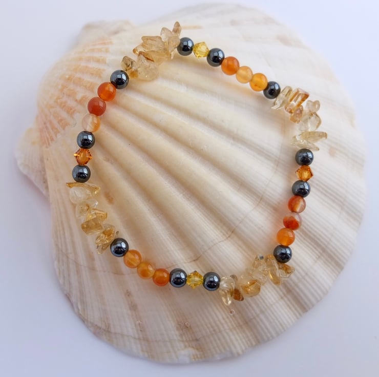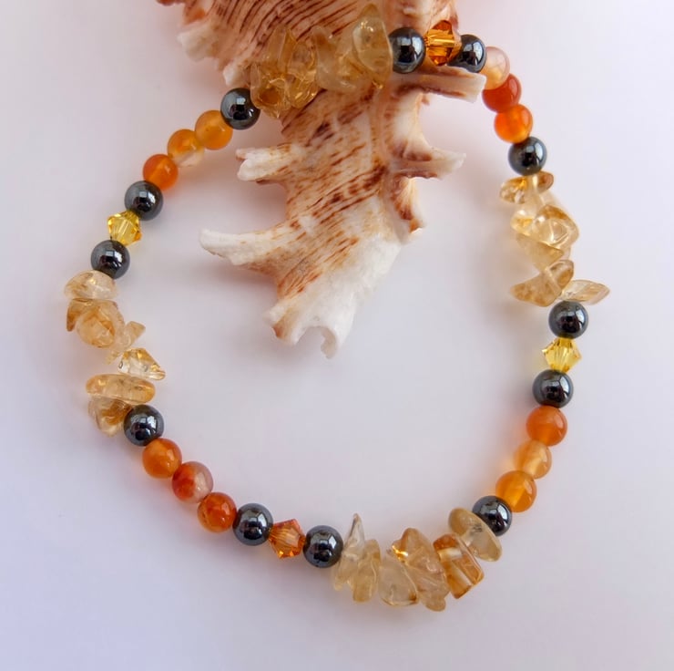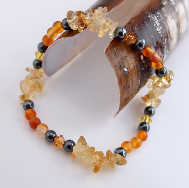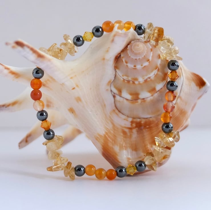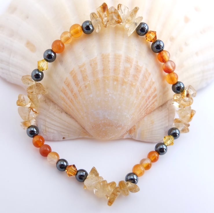 Pale yellow citrine chips, sparkly Swarovski crystals in the colours "topaz" and "light topaz", orange carnelian and gunmetal hematite beads make up this stretch bracelet.