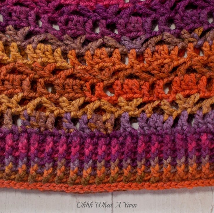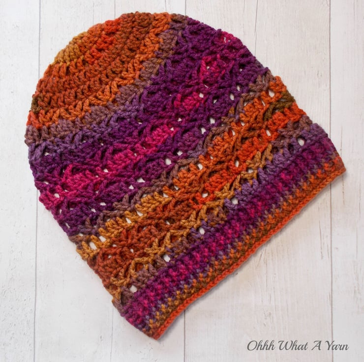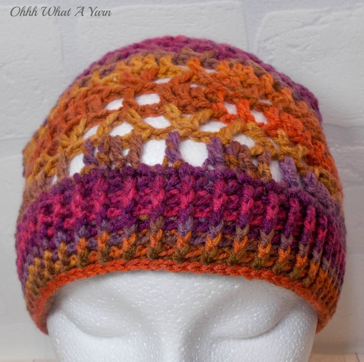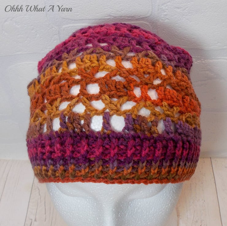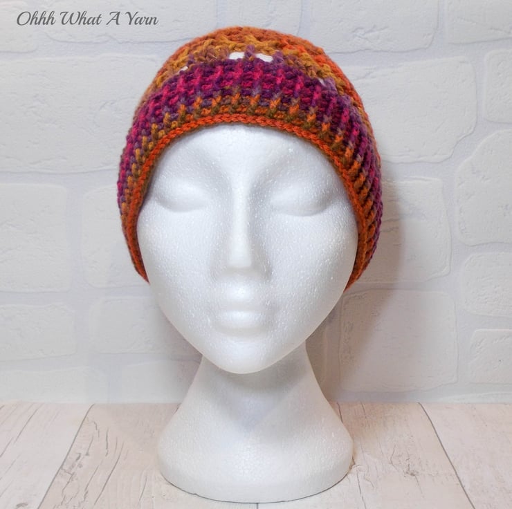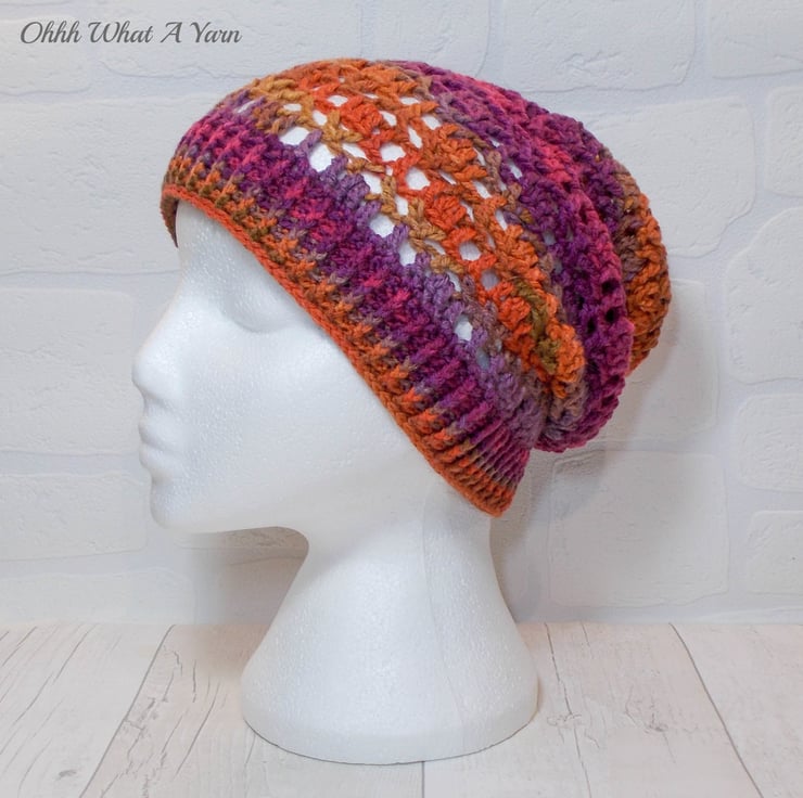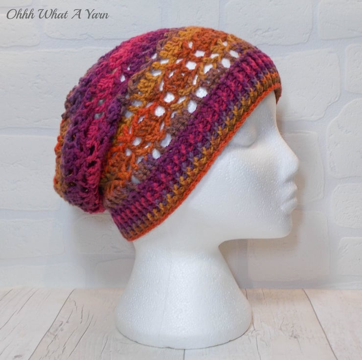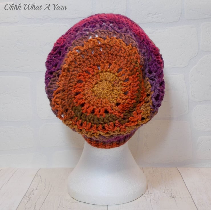 This gorgeous lacy slouch hat has been crocheted using a 100% acrylic colour changing yarn in beautiful autumnal shades.