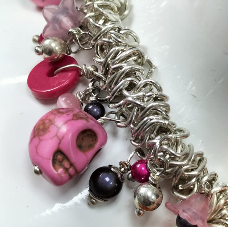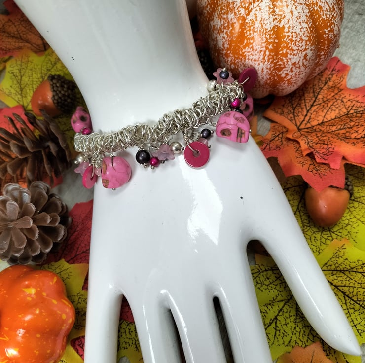 Looking for something different for Halloween? This has to be the ideal bracelet with it's pink howlite skulls and deep purple miracle beads alongside a selection of smaller beads.