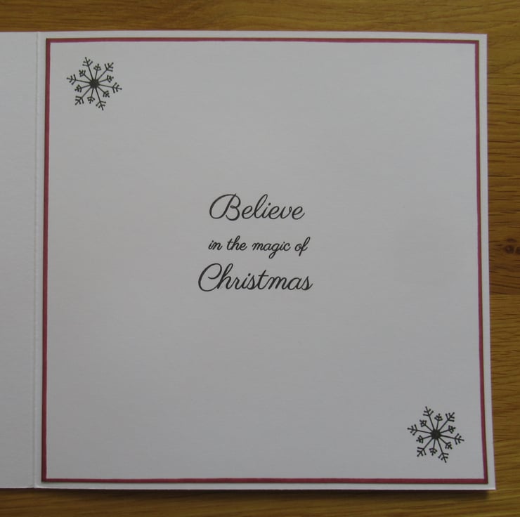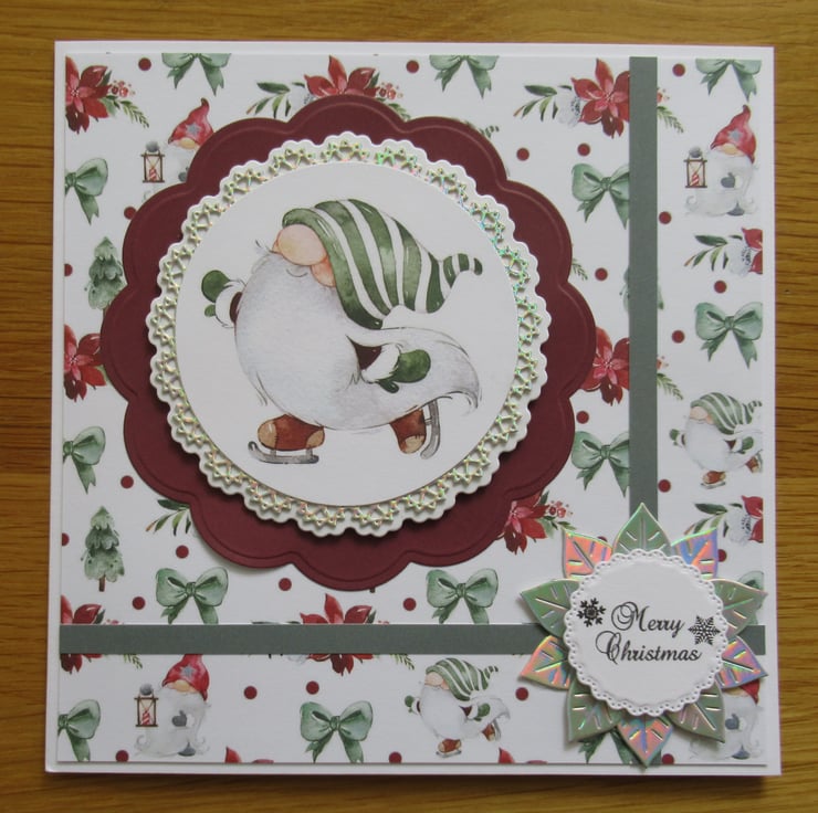 This lovely ice skating gnome takes pride of place on this card, surrounded by 3 circular decorative die cut mats and raised with 3D foam pads. The image is in muted tones of teal and burgundy and sits upon a gnome patterned background card. The silver poinsettia on the front has been die cut and home made by me as a finishing element and the inside coordinates with a stamped greeting as pictured.