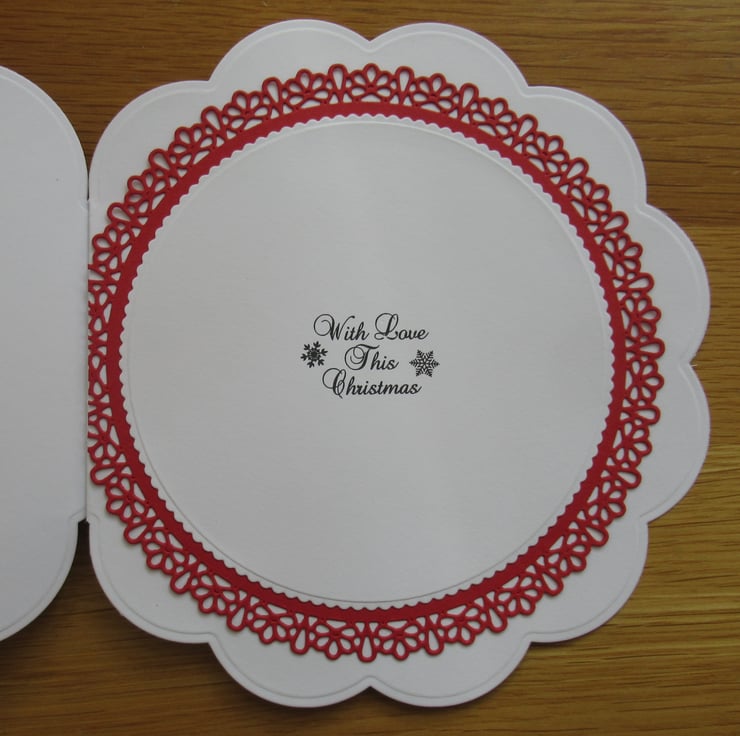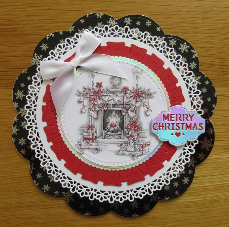 This is a modern style and coloured card, in an unusual circular shape which does stand up due to the scallop edging. It features the image of a fire place with a lit fire, surrounded by Christmas decordations and gifts, in tones of red and grey. It is embellished with a white satin ribbon, and has been cut, mat and layered with 4 different circular dies in black, silver, red and white card to coordinate with the image. There is a Merry Christmas greeting on the front which has been raised with 3D foam pads and the inside is finished to coordinate with a stamped With Love This Christmas greeting.
