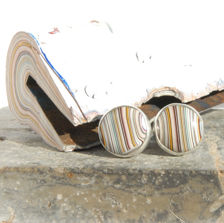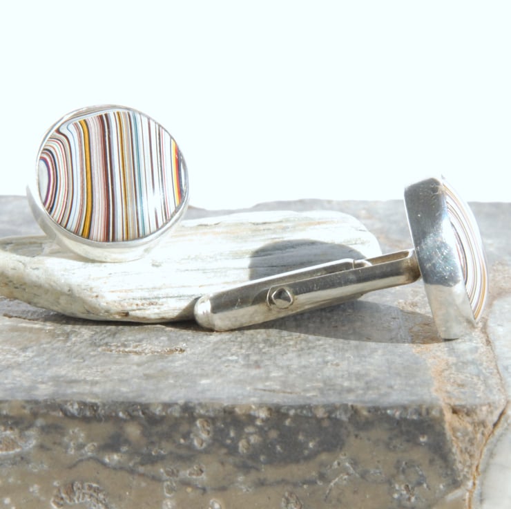 These classic cufflinks feature round cabochons of vintage Dodge fordite bezel set in sterling silver and finished with sterling silver swivel fittings. The fordite has a white based colour palette with close stripes of yellow, red, blue and just a little orange, the patterns almost match. These cufflinks would make the perfect gift for a gent who loves his classic cars, they measure 15mm in diameter and approx 5mm deep (and come in a gift box).