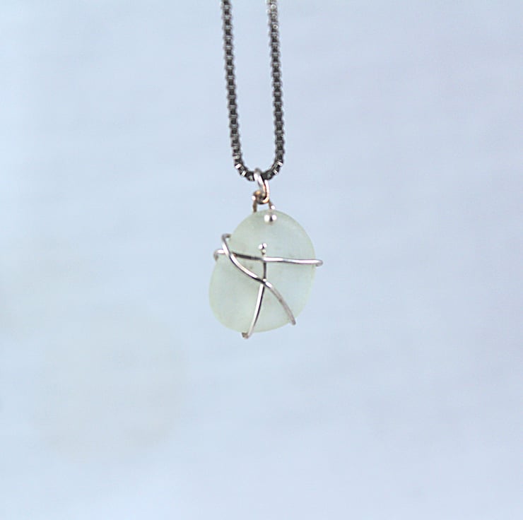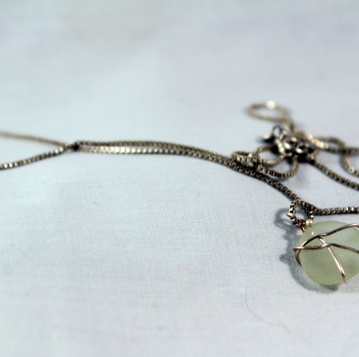 A smooth oval of sea glass, white with a tiny hint of green. Becuase the oval is so smooth and perfect I wrapped it in wire rather than beading around it so the shape can be seen. It hangs from a re-used box chain approximately 45cm long. The chain was bought from a collectors market, probably with a little pendant, which will turn up somewhere else in my jewellery.