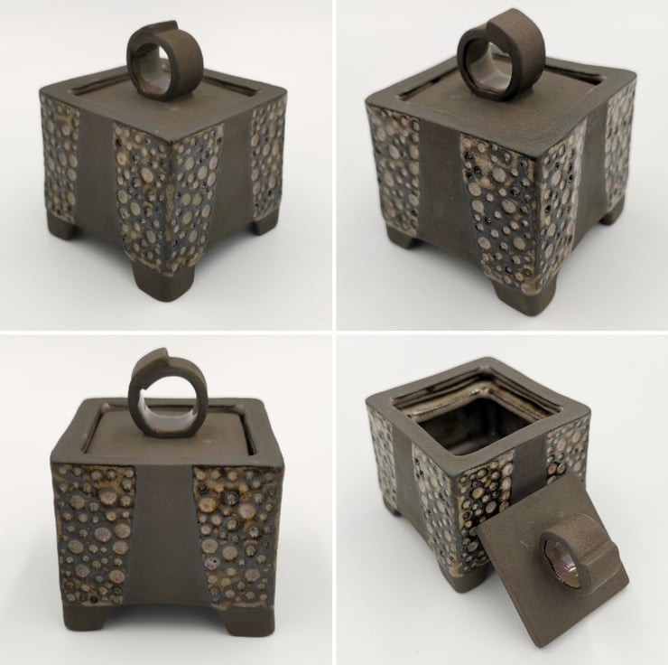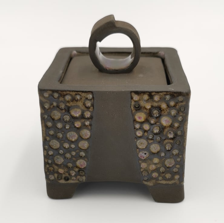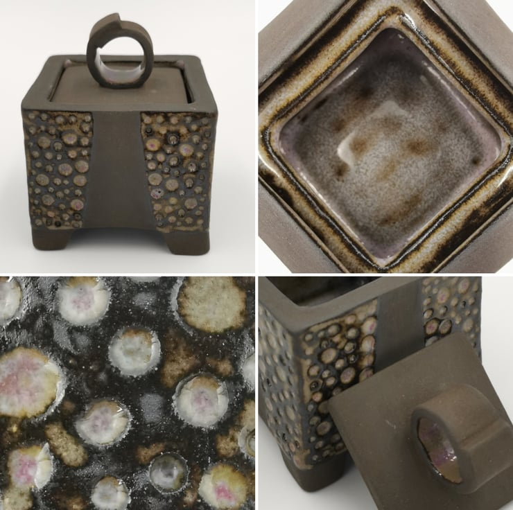 Small box jar. These are slab built by hand using Vulcan black clay with a hand impressed design, finished in a grey glaze with flashes of pink.
