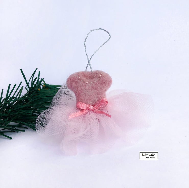 This listing is for a pretty Christmas tree hanging decoration featuring a ballerina outfit complete with tutu skirt and leotard. This pale pink ballet costume has been needle felted using wool fibre. The net tutu is embellished with a ribbon bow and further details have also been embroidered with silver coloured metallic thread. The tree decoration measures 12cm including the hanging loop.