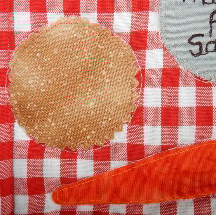 Add your treats for Father Christmas to this fun mug rug which measures 9 x 5.5 inches (23x14 cm). It features a mince pie, carrot for the reindeer and a place to put Santa's glass of milk, all appliqued on. It could also be used as a table centre, or decoration. It is made from red and white gingham fabric, with a jolly penguin border and a red and white spot fabric on the reverse. It also has a layer of cotton wadding inside.