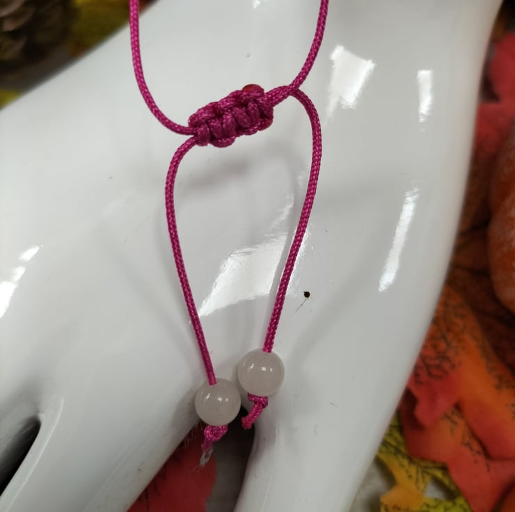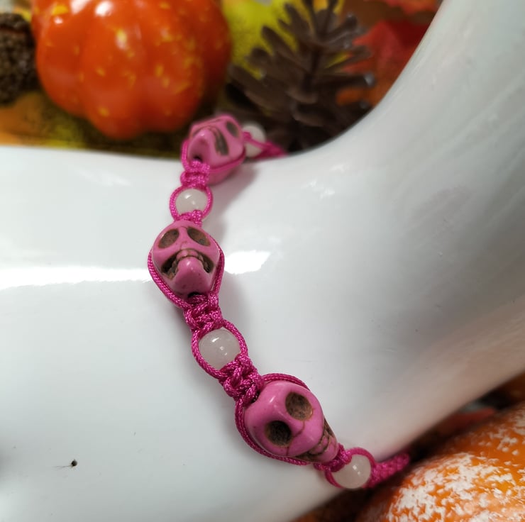 Pink Howlite skull bracelet encased in pink cord with macrame knots and a slider fastening to allow for fitting.