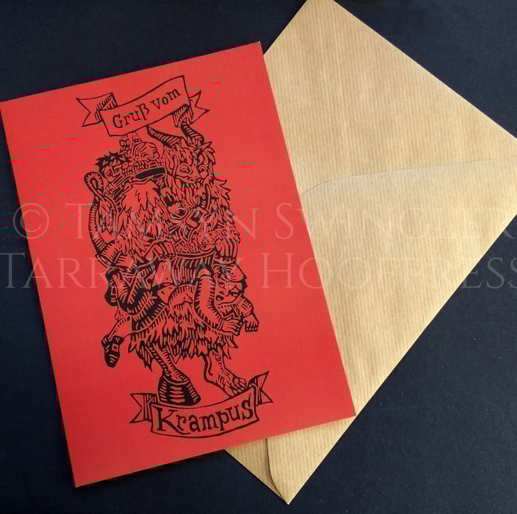 It is A5 in size when folded (approx 15 x 21 cm) and is printed onto a 300gsm card stock, coated for a shine on the front and back and uncoated inside for ease of writing. It comes with a brown ribbed envelope, and Krampus also features on another card design in the shop as well as the option for a pair, do have a look around! It would also look striking framed and added to your home decor!