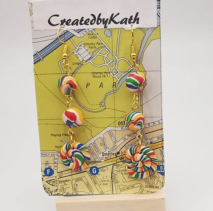 An unusual shell bead in rainbow coloured swirls provide the focal point on these unusual statement earrings. Each bead is handcrafted in polymer clay, threaded with gold wire, looped and linked to the next bead, ensuring soft flow of movement.