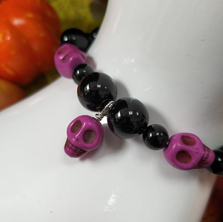 The skulls are 12mm and thread onto elastic with the 10mm and 6mm black beads.