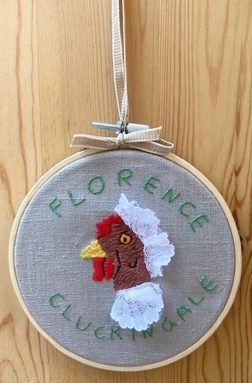This "Florence Cluckingale" chicken with her natty lace bonnet and collar has been hand embroidered onto a 5" bamboo embroidery hoop. The hoop is backed with cream felt and there is a beige piece of ribbon tied to the hoop so you can hang it on the wall.