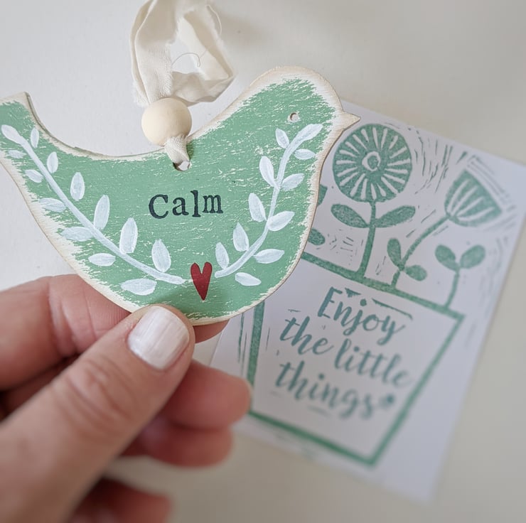 Painted Wooden Bird Hanging Decoration 'Calm'