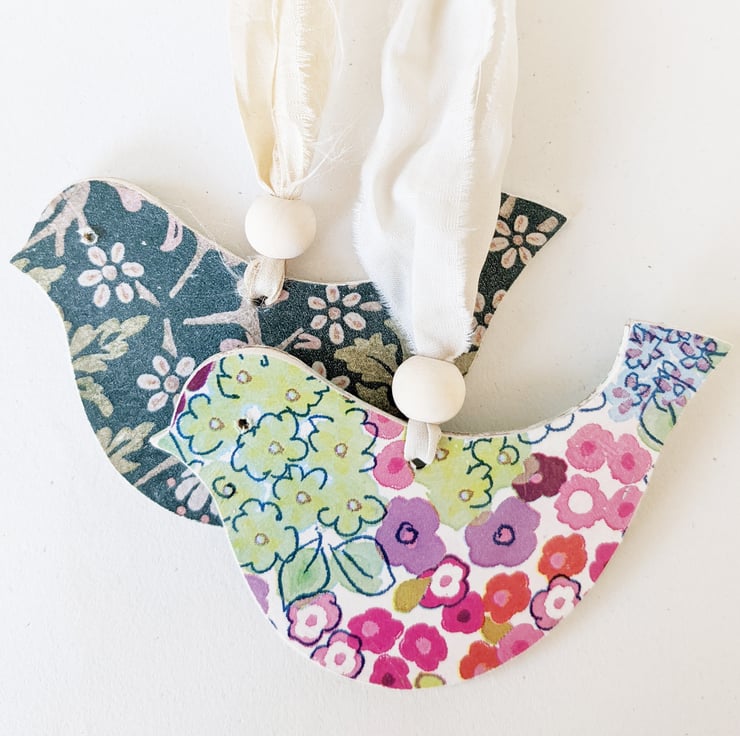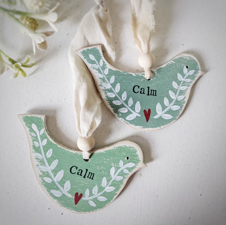 Hand painted with pretty leaf motif and stamped words this one of a kind bird hangs with silk ribbon and a wooden bead.