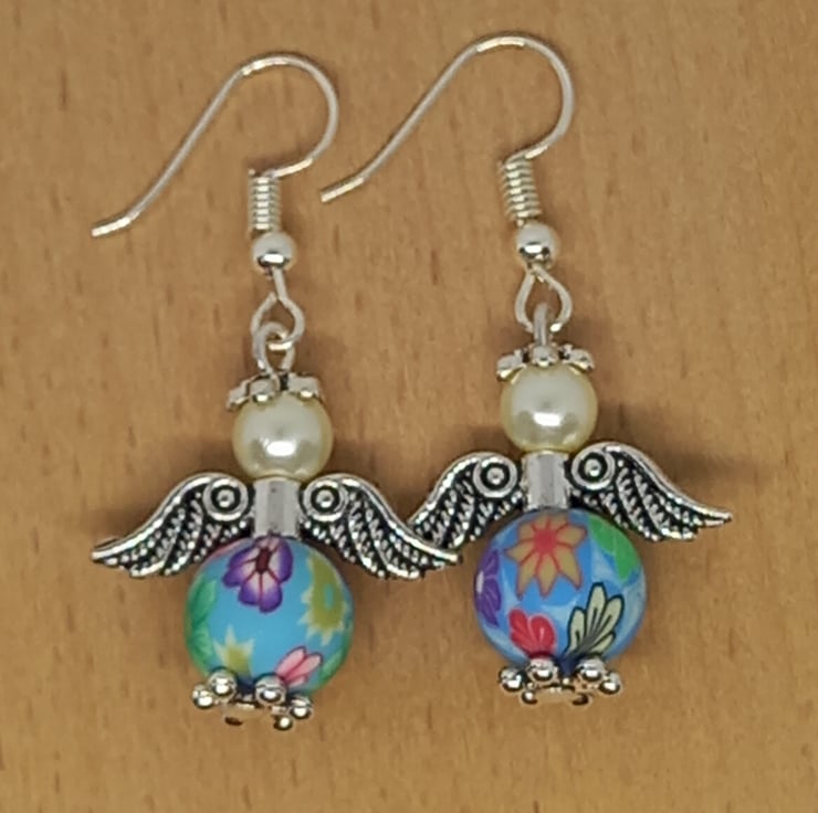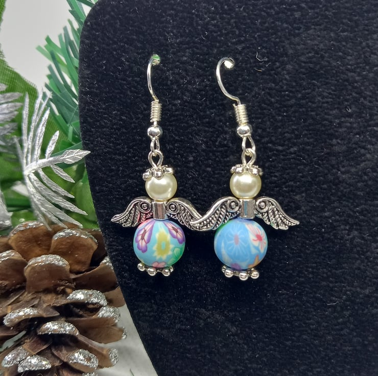 These angel earrings feature polymer clay beads and glass pearls, with metal spacers, wings and bead caps. These lightweight lovelies hang from silver plated ear hooks.