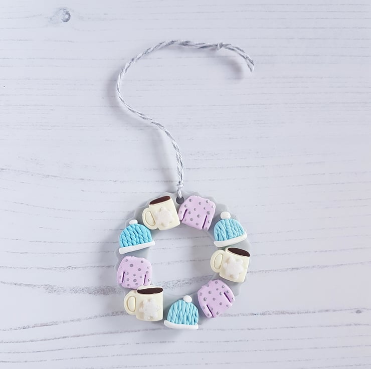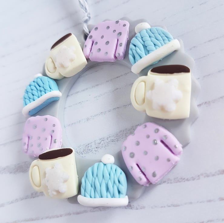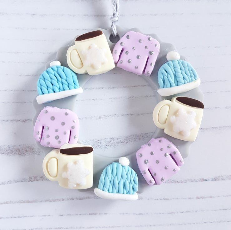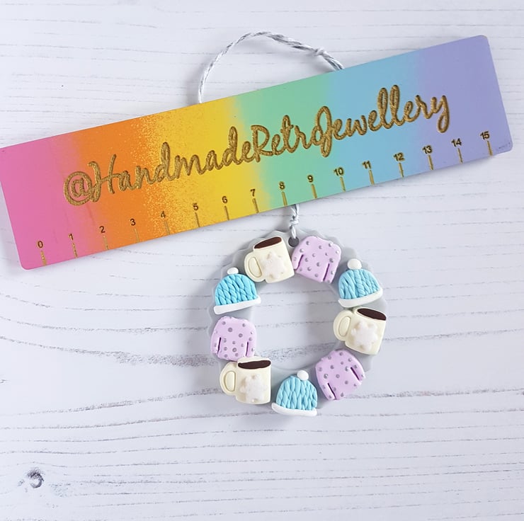 A beautiful Winter themed wreath decoration, made from grey polymer clay, with a collection of different icons of Winter all around the edge including cosy jumpers, wooly knitted hats and hot chocolate or coffee mugs! All hand made using various colours of polymer clay with detail hand painted using acrylic paint. A great way to decorate your home this season!