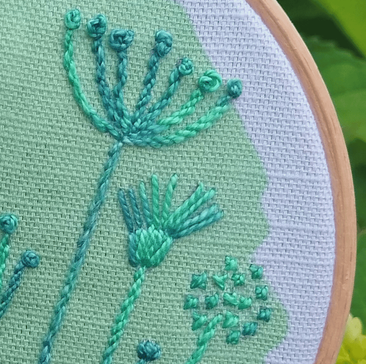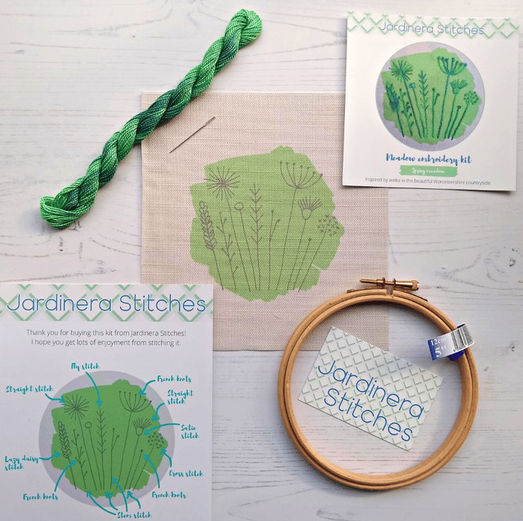 A deliciously spring green meadow embroidery design in leafy colours. This quick to sew embroidery kit uses a number of simple stitches and comes with full printed instructions - easy to follow if you're new to embroidery. It is stitched with stunning hand-dyed thread light greens.