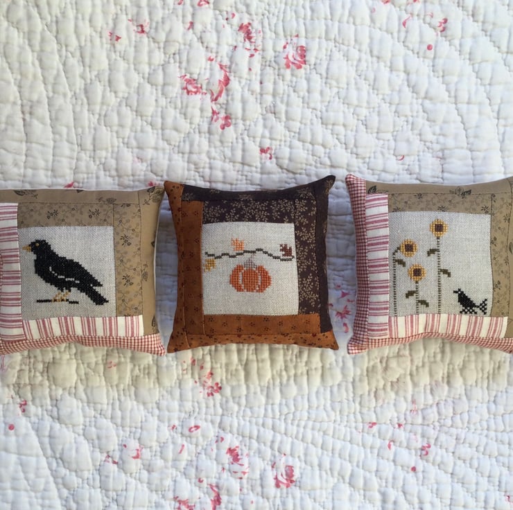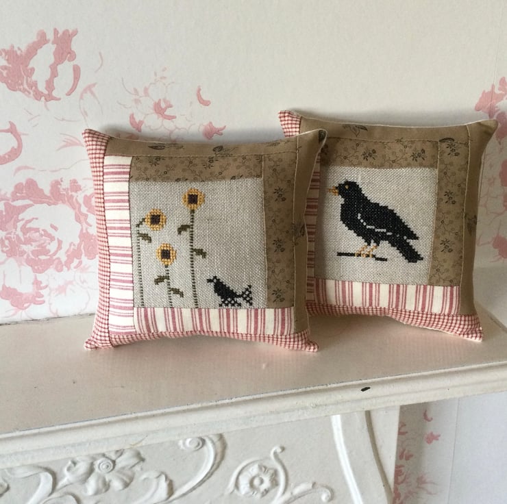 A small decorative shelf cushion, with a centred cross stitch embroidery, finished off with a log cabin patchwork border.