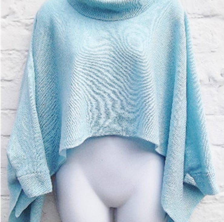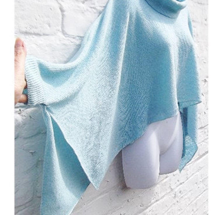 Nice, easy to knit lightweight 3 ply poncho style garment designed for standard gauge knitting machines with ribbers. Knitted sideways, it is simplicity itself! Short baggy styling (but can be made in a longer version) with a light, flowing, sensuous feel and a generous drape. Full needle rib is used for the cuffs and turned over collar. Pattern goes up to a 52 inch bust. Knit in any 3 ply yarn which matches the pattern tension.