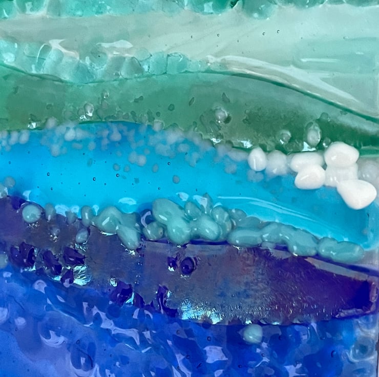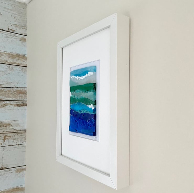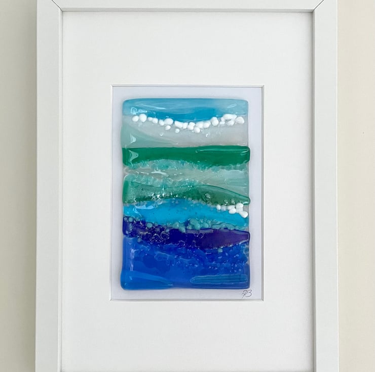 Stunning and completely original fused glass seascape picture, created with glass pieces that capture the light and depth of the ocean. Made with a mixed blues and greens, including some iridescent glass. Handmade in my studio in Dorset, inspired by views from my local beach.