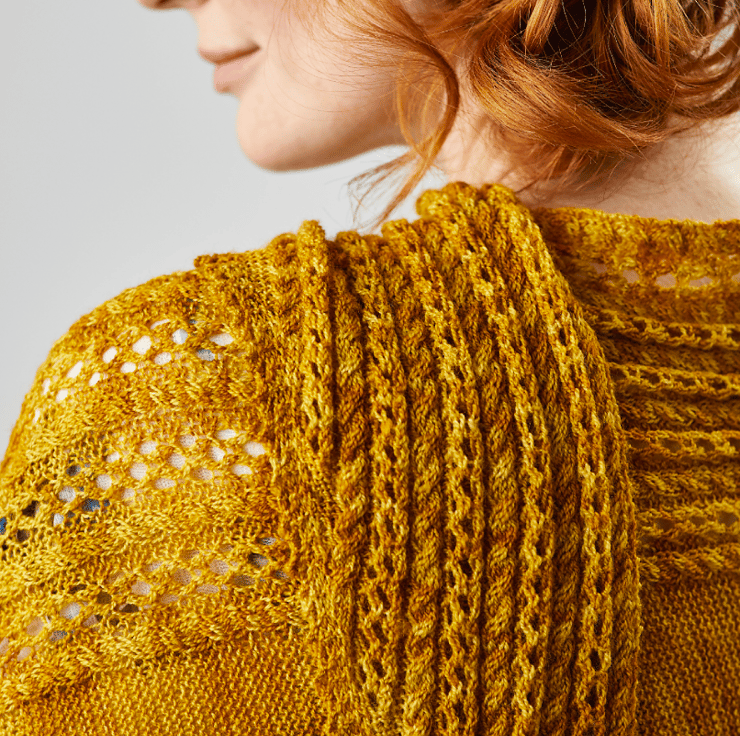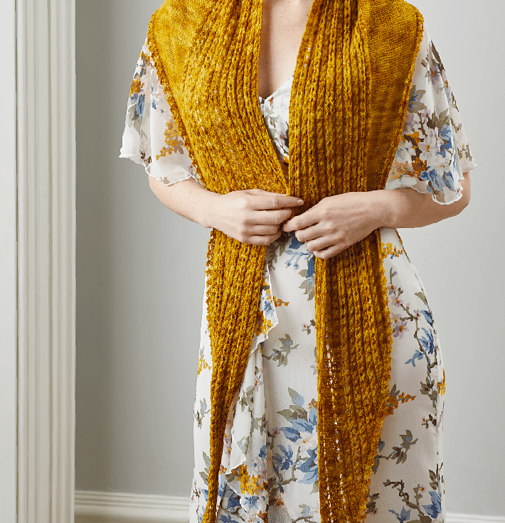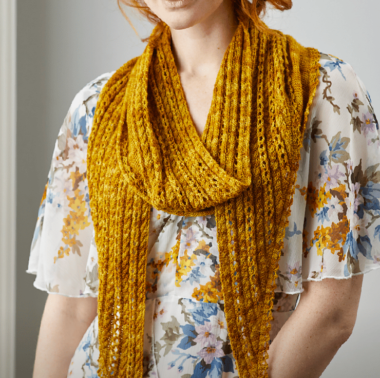 Super-long and draping, this shawl design by Sandra Nesbitt has a shallow crescent shape. It’s achieved by casting on a small number of stitches, gradually increasing to the central section, then decreasing again slowly. A pretty stitch pattern is used along one length of the shawl, while the opposite edge has a lacy border. The design is complemented by the use of a hand-dyed yarn from The Yarn Collective. Written instructions for all the chart patterns are provided.