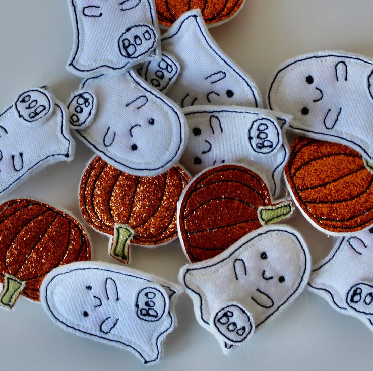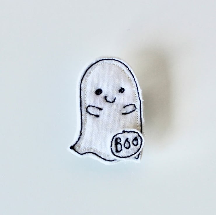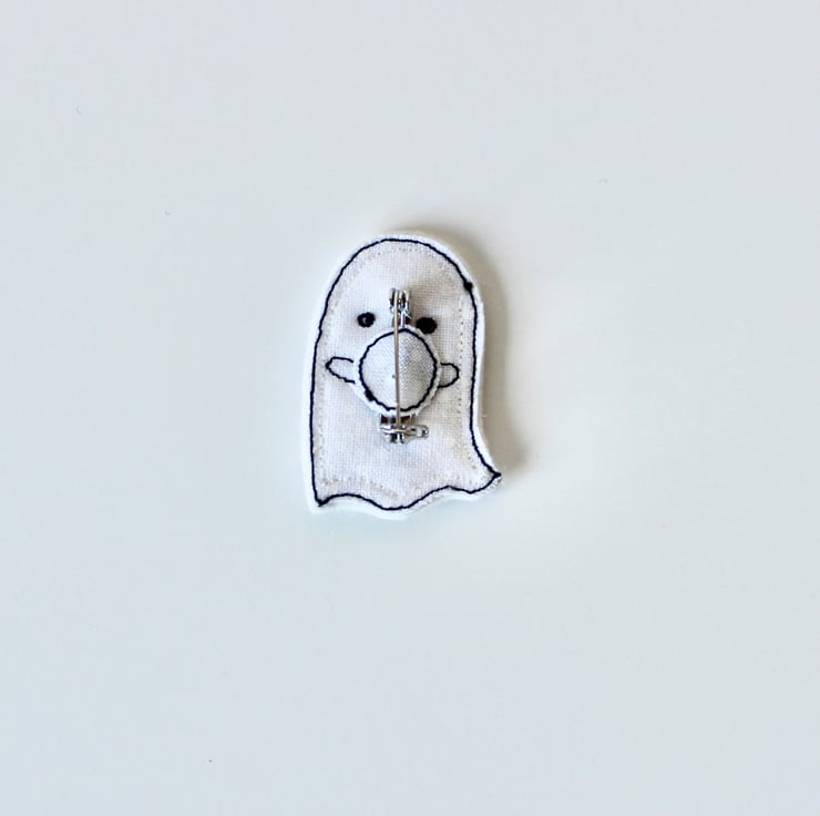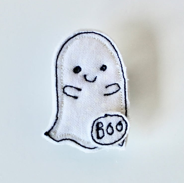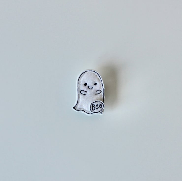 Each 'Boo Ghost' brooch is created using multiple layers of cloth and freehand machine embroidery which are then cut out by hand using very sharp scissors. The pin on the back is attached with hot glue and a sewn fabric circle to secure.