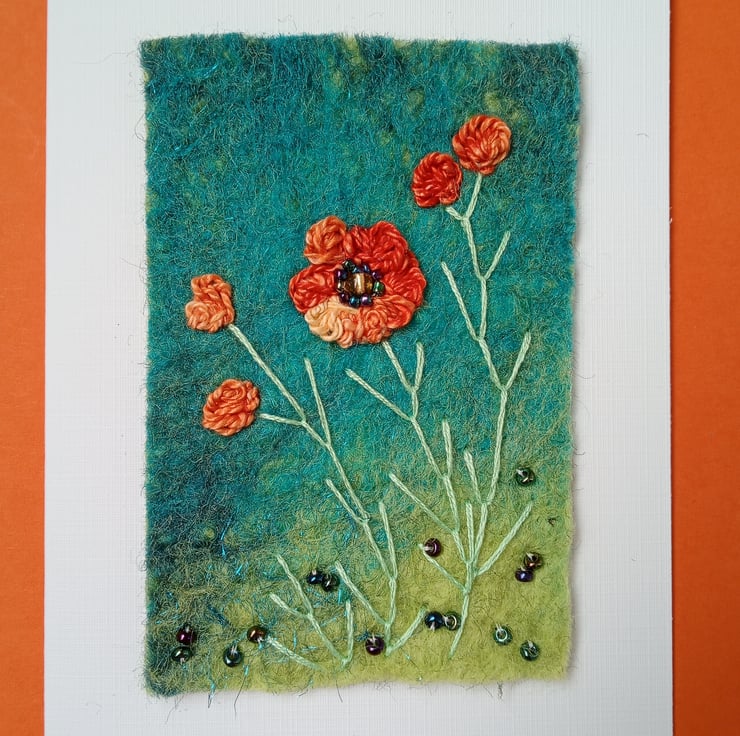 This is a unique card made from handmade felt. A beautiful orange flower has been hand embroidered onto a dark sparkly green piece of felt. The design has been embellished with beads.