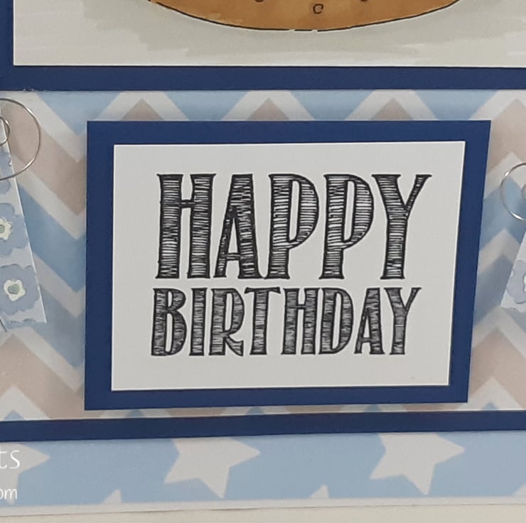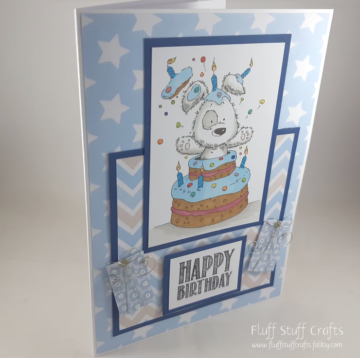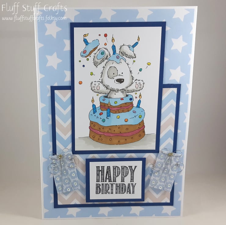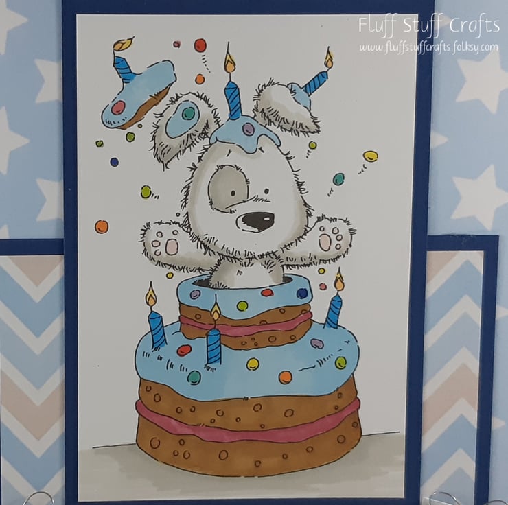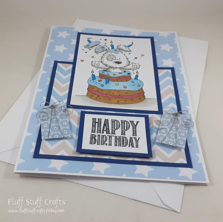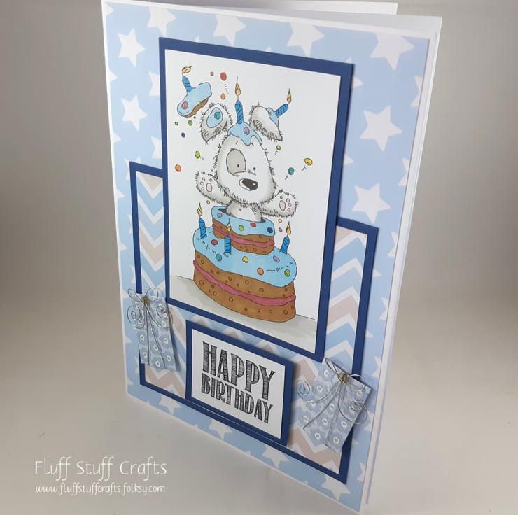 A5 sized, blue birthday card featuring a hand coloured image of a dog popping out of the top of a cake, sending icing and candles flying. The image, along with the sentiment 'Happy Birthday ' have been mounted onto dark blue card, over a panel of blue and beige zig zag patterned paper. They are overlaid onto a background of white and pale blue, star patterned paper. The card is further embellished with 2 parcel toppers.