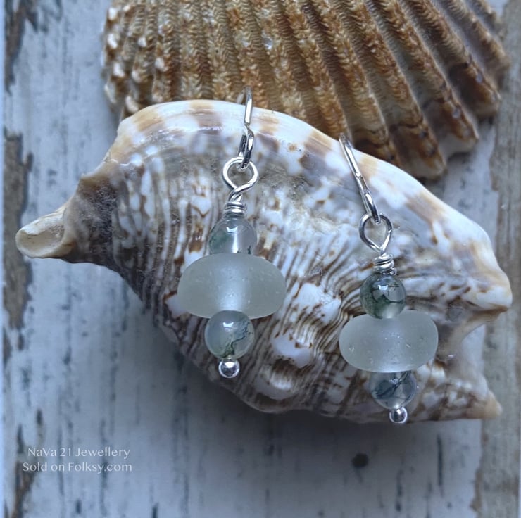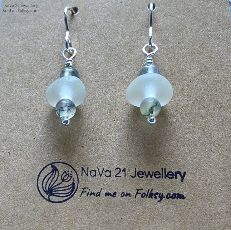 Featuring: Moss Agate semi precious bead, Pale Aqua Seaglass,Sterling silver bead and wire.