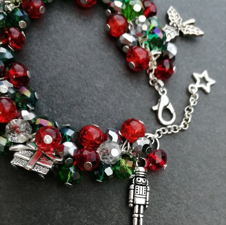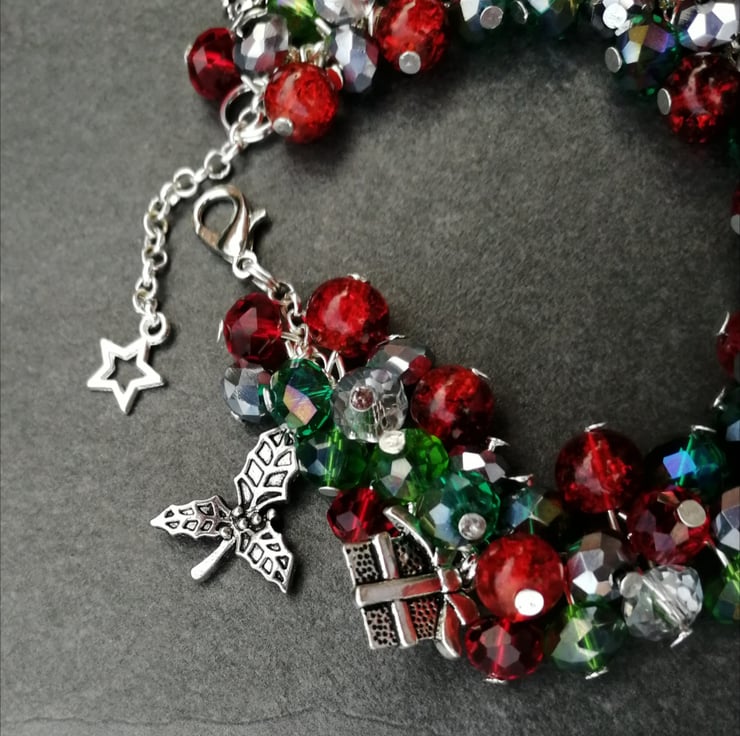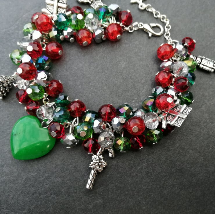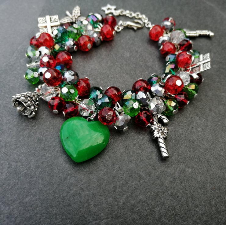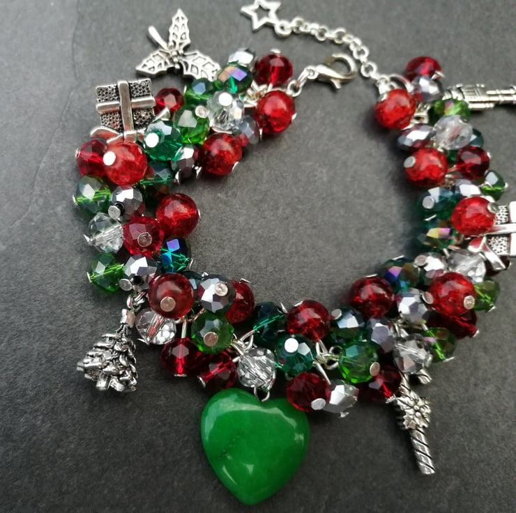 This festive bracelet is made with all glass beads, silver plated chain and charms and finished with a jade heart. Please send me a message with your choice of length. If I do not receive a message I will send as pictured.