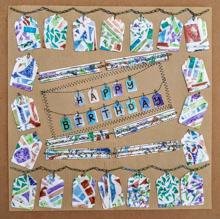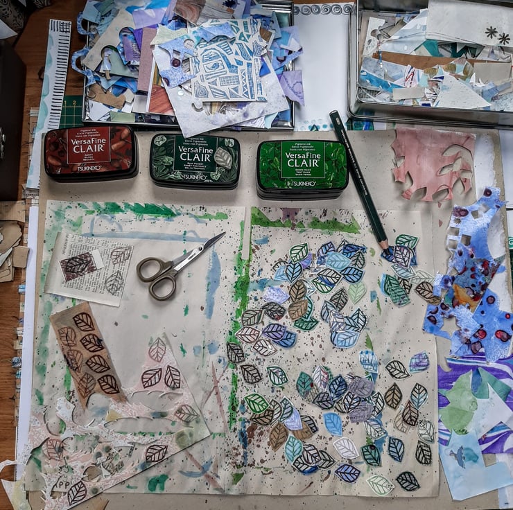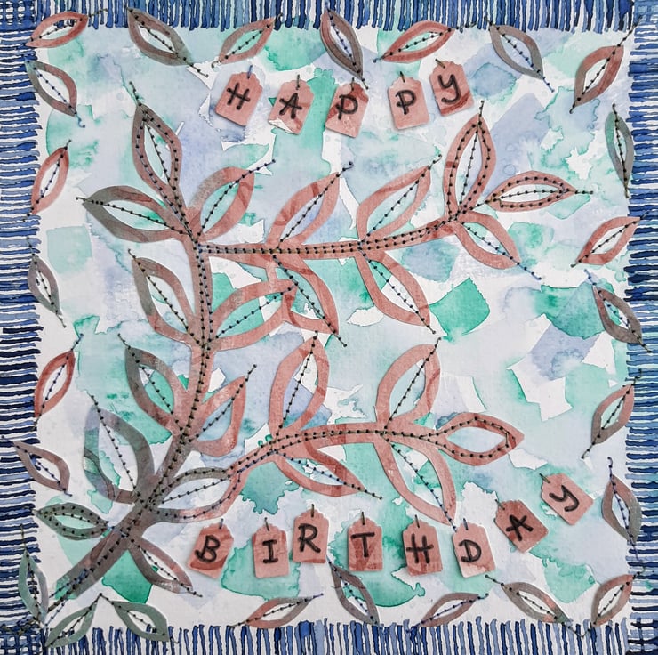 These designs feature printing, paper collage and sewing (hand and machine), often using small scraps of paper left over from other projects, that are too beautiful to throw away or discard. See my work-in-progress photo for the leaves birthday card.