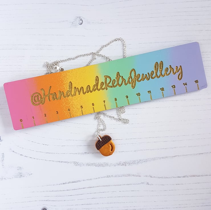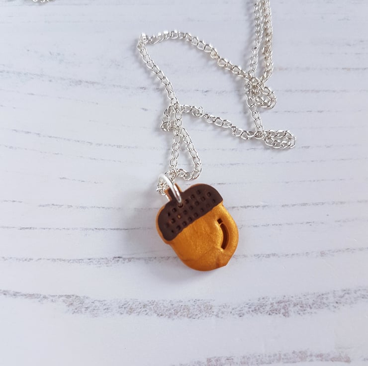 This beautiful golden acorn pendant is made of polymer clay, with detail added using acrylic paint.